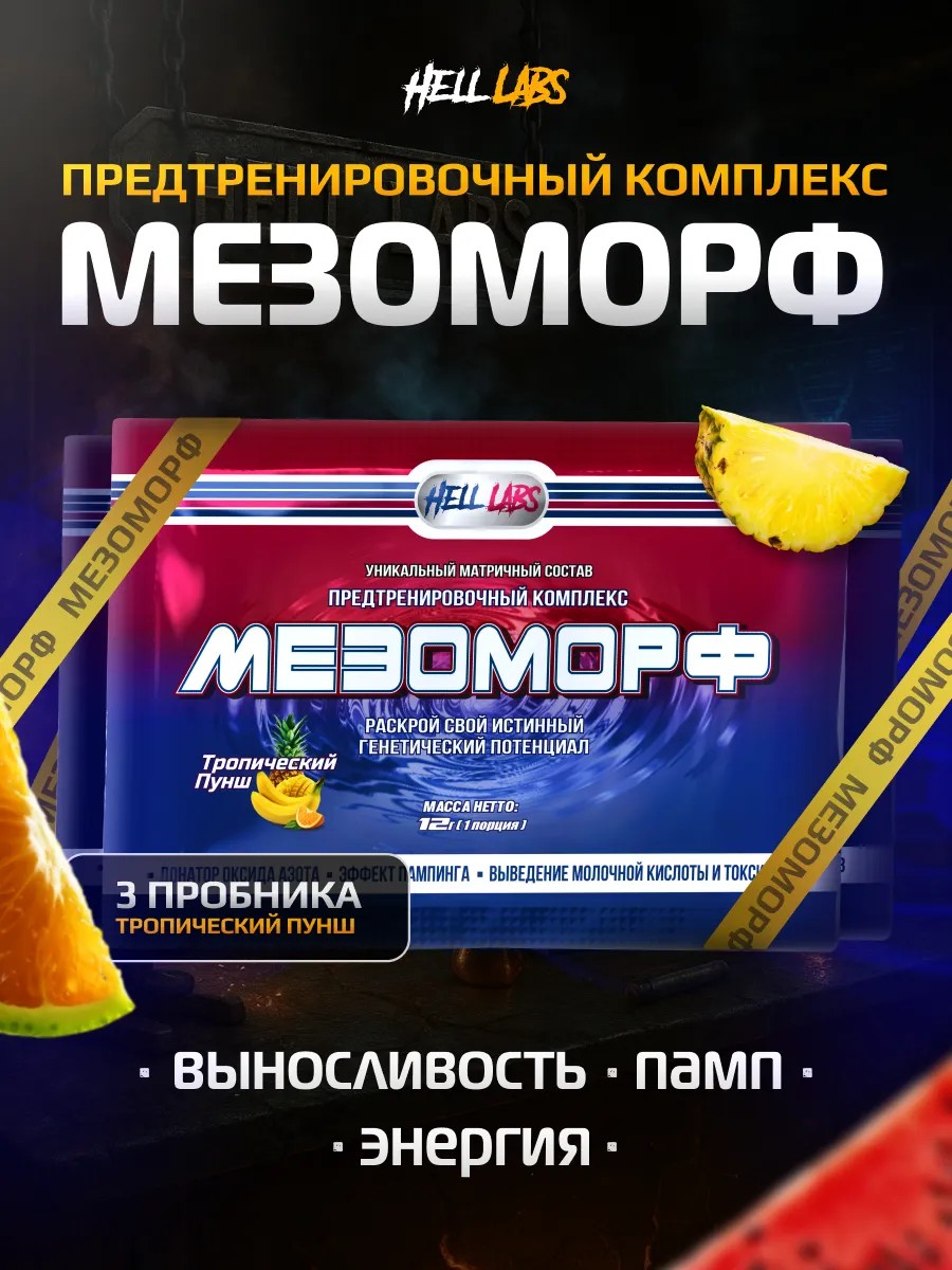 Хелл лабс МЕЗОМОРФ 15 грамм усилен ингредиентами для пампинга – аргинин, цитруллин и аргинин альфа-кетоглутарат! Этот предтрен повысит продуктивность организма во время тренировки, даст прибавку к силовым и общей энергии, усилит концентрацию внимания и выведет излишек молочной кислоты из мышц.