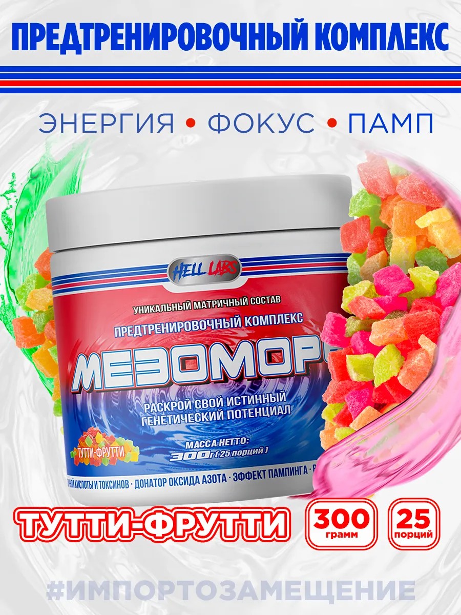 Хелл лабс МЕЗОМОРФ 300 грамм усилен ингредиентами для пампинга – аргинин, цитруллин и аргинин альфа-кетоглутарат! Этот предтрен повысит продуктивность организма во время тренировки, даст прибавку к силовым и общей энергии, усилит концентрацию внимания и выведет излишек молочной кислоты из мышц.