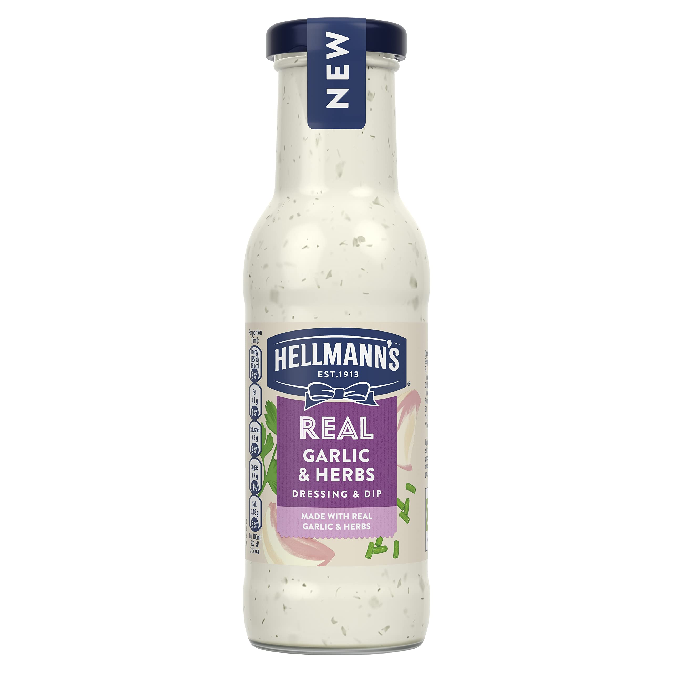 Hellmann's Salad Dressing Garlic 250ml INGREDIENTS Water, rapeseed oil, yogurt (10 ) (milk), spirit vinegar, sour cream (5 ) (milk), egg yolk, sugar, garlic (2.3 ), modified corn starch, salt, lemon juice, herbs (0.2 ), stabilizers (guar gum, xanthan gum), preservative (potassium sorbate), [unclear] INSTRUCTIONS FOR USE Shake well before use. Drizzle over salads and vegetables or use as a dip for pizzas, hamburgers, pasta, or chicken wings. Store in a cool, dry place after opening. See more