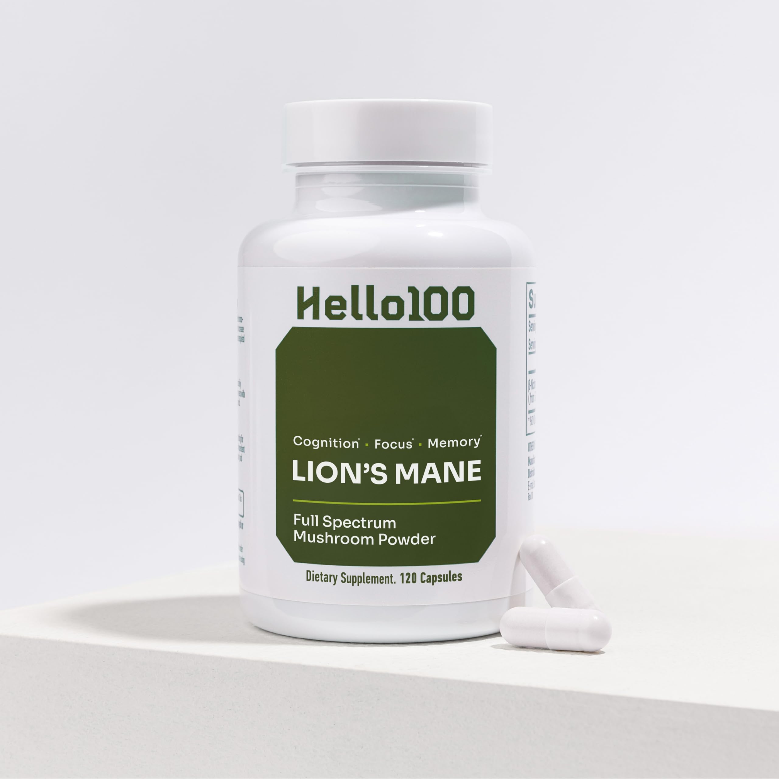 Hello100 Lion's Mane delivers a high-potency 1000mg serving of premium Hericium erinaceus to support daily cognitive performance. Known as one of the most popular functional mushrooms, Lion's Mane is valued for its ability to help maintain mental clarity, focus, and overall brain wellness. Each serving provides 1000mg of pure Lion's Mane mushroom in an easy 2-capsule daily dose. Whether you're working, studying, or looking to stay sharp throughout the day, this natural nootropic is designed to support clear thinking and cognitive balance. In addition to its cognitive benefits, Lion's Mane contains naturally occurring beta-glucans and antioxidants that help support a healthy immune system and overall well-being. Hello100 ensures every bottle meets strict quality standards. The formula is non-GMO, vegan-friendly, and free from gluten, soy, dairy, and artificial additives. Manufactured in a high-quality facility and batch-tested to ensure purity and consistency.