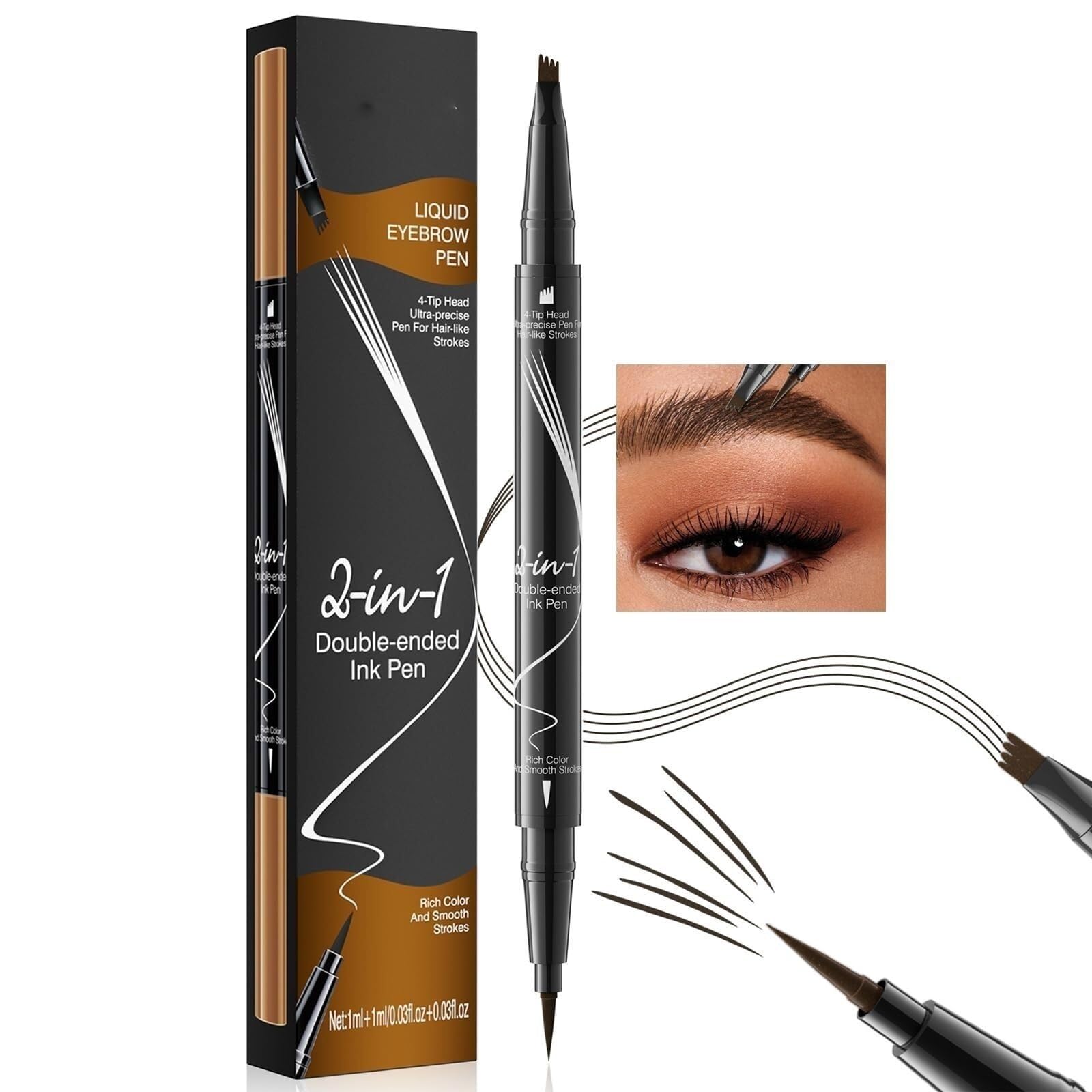 Hellokiss Liquid Eyebrow Pen,3D Microblading Eyebrow Pencil Upgraded Waterproofwith 4-Fork-Tip Precise Brush-Tip,Create Natural Hair-Like Brows Features: - Ensuring that your eyebrows stay defined and in place all day - The smooth and rich texture of the pencil ensures a seamless and flawless finish - By using our eyebrow contouring pen and pencil, you can enhance your eyebrows and create the appearance of fuller Specifications: Name: Eyebrow Microblading Pen Color: Light Brown Dark Brown Gray Black Application: Suitable for all skin types Type: Four pointed. Package included 1 2pcs Microblading Eyebrow Pencil Notes: 1. Please allow slight size errors due to manual measurement. 2. Due to differences between monitor displays, actual color may vary slightly from image.Thanks for your understanding.Tips---For best results, use the brow pen on clean, dry skin, from moisturizers or other skincare barriers. Apply directly onto your brow area for a smoother, more finish that stays flawless throughout the day. Waterproof Microblading Eyebrow Pencil---All-Day Waterproof and Long-Lasting. Our advanced formula ensures your makeup stays intact all day, even through sweat, rain, and water sports. Enjoy worry beauty with no smudging or fading, keeping your eyebrows perfect from morning till night. Hellokiss Liquid Eyebrow Pen---Adored by novices and experts alike, this microblade-inspired brow pen simplifies outlining and filling your brows with lifelike accuracy. Layering strokes adds depth and dimension, delivering crisp, authentic-looking eyebrows in record time. 2024 New Waterproof Eyebrow Pen---Experience the unique design of our Eyebrow Pen, featuring an innovative four-point pen tip that allows for effortless application. Brush your eyebrows with ease, ensuring clear roots and a natural, look. Its innovative 4-pronged 3D fork design allows for precise Application, effortlessly creating a natural-looking effect in no time. 4-Tip Upgraded Waterproof Microblading Eyebrow Pen---Elevate your brow game with our Hellokiss Liquid Eyebrow Pen, offering unparalleled precision compared to traditional pencils.s. Each stroke creates clear, defined eyebrows, drawing everyone's attention.