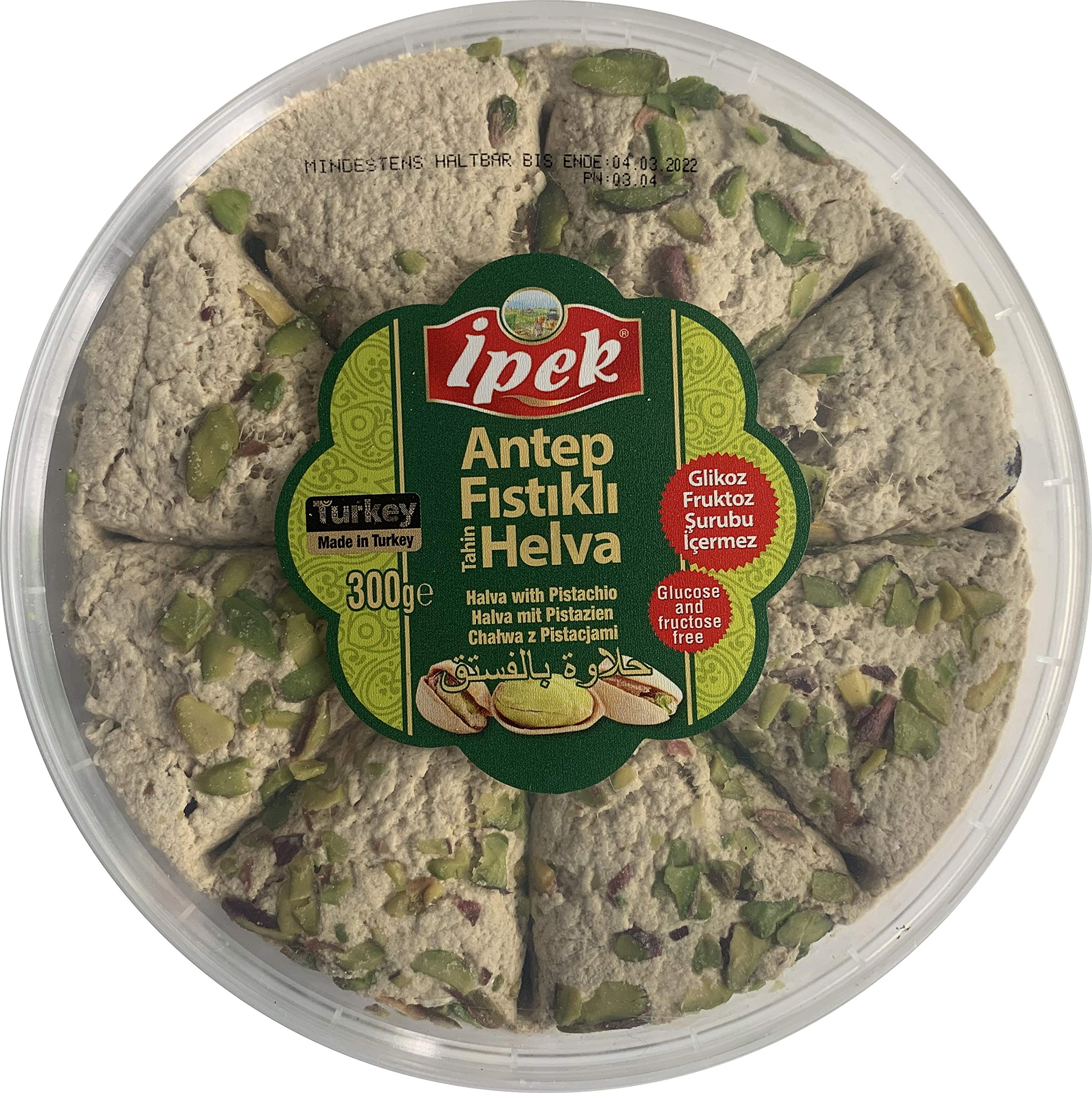 IPEK - Helva with pistachios 300g - glucose and fructose -free Ipek Helva - Halva with pistachios.Enjoy Helva for the early in the morning . as dessert . at the picnic . snack on helva in between . Store cool and dry. The emulsifiers used are of vegetable origin The product is a fiber source. Allergen notes: Product of sesame seeds (tahin) and contains soap cabbage and pistachio. Ingredients: sesable (54-60 ), sugar (sucrose), pistachios (8 ), vegetable emulsifiers, mono and diglycerides of food fatty acids E471 (plant), soapwort root extract, citric acid (E330), vanillinaroma. Made in Turkey Ingredients ingredients Sesable (54-60 ), sugar (saccharosis), pistachios (8 ), vegetable emulsifiers, mono and diglycerides of food acids E471 (vegetable), soapwort root extract, citric acid (E330), vanillinaroma.