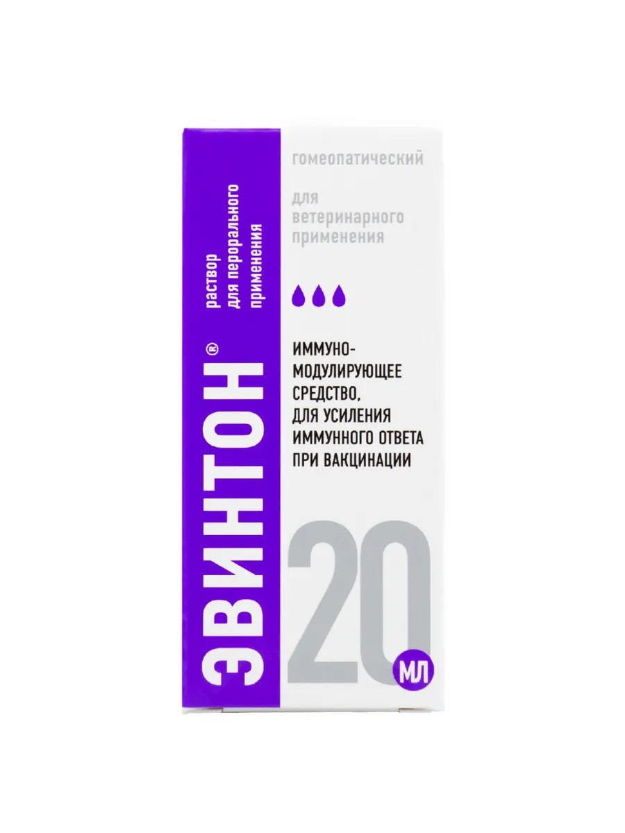 Эвинтон раствор для перорального применения назначают в качестве иммуномодулирующего средства собакам и кошкам для профилактики и в комплексной терапии респираторных и желудочно-кишечных заболеваний инфекционной этиологии, для усиления иммунного ответа при вакцинации, для лечения вирусного папилломатоза.