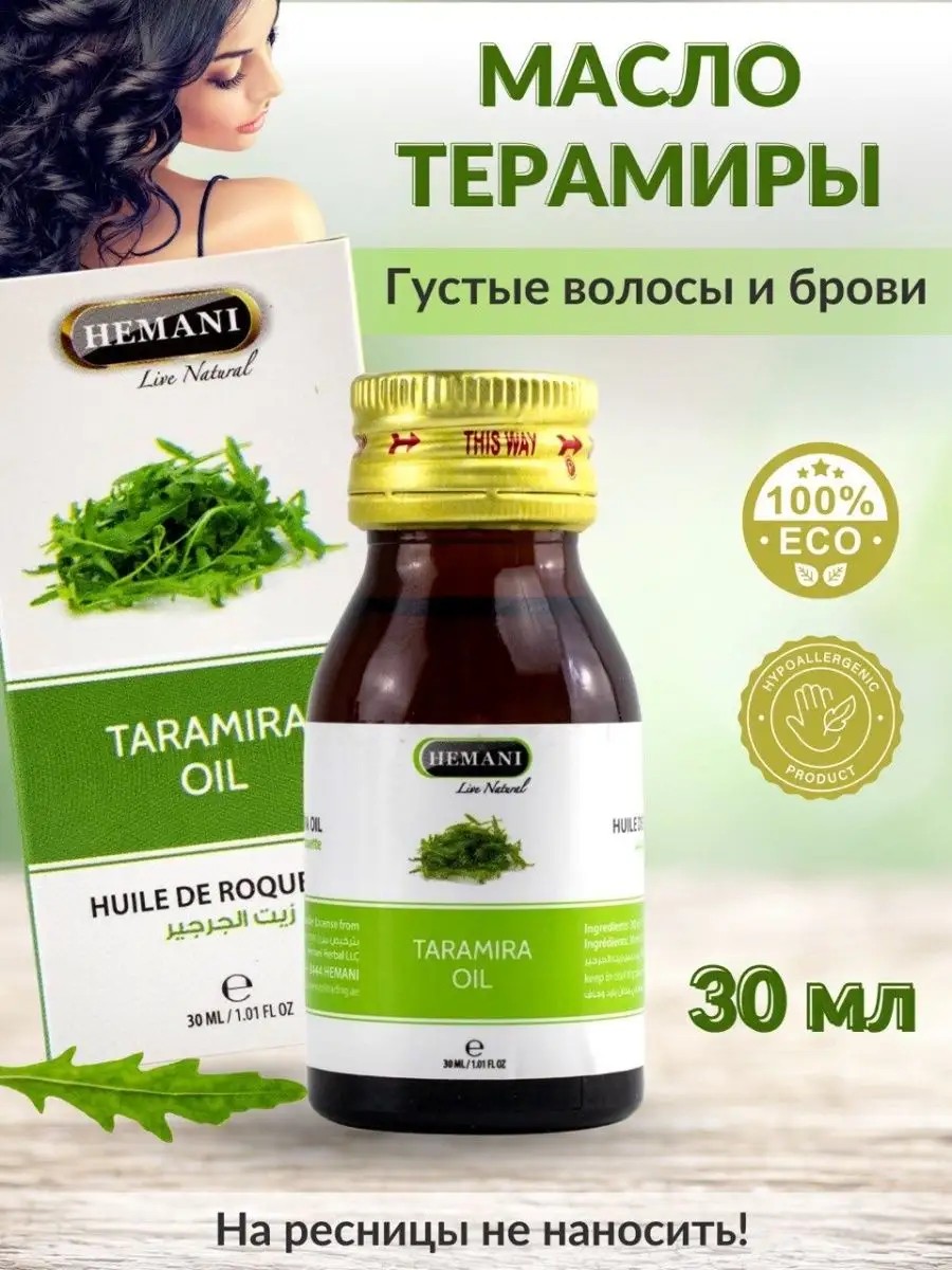 Масло тарамира (она же руколла) является эффективным стимулятором роста ресниц, бровей и волос. Масло прямого холодного отжима получают путём отжима листьев растения. В составе такого масла содержится сок усьмы. При курсовом применении масла достигаются прекрасные результаты. Особенно это актуально в осеннее - зимний период времени, когда волосы нуждаются в особенном уходе. Волосы становятся сильными, здоровыми, они менее подвержены неблагоприятным внешним воздействиям, а также к повреждающим факторам укладочных приспособлений: плойки, фены, завивки, бигуди. Способы применения для ресниц и бровей: нанести масло в чистом виде перед сном с помощью ватной палочки на брови, а также на места, где нет волосков, но необходимо их появление ; или смешать несколько капель масла тарамира с другими базовыми(миндальное, касторовое, персиковое, репейное), но при этом они должны быть чистыми без добавок и также нанести на волоски. Натуральное масло холодного отжима терамиры 30ml Hemani .