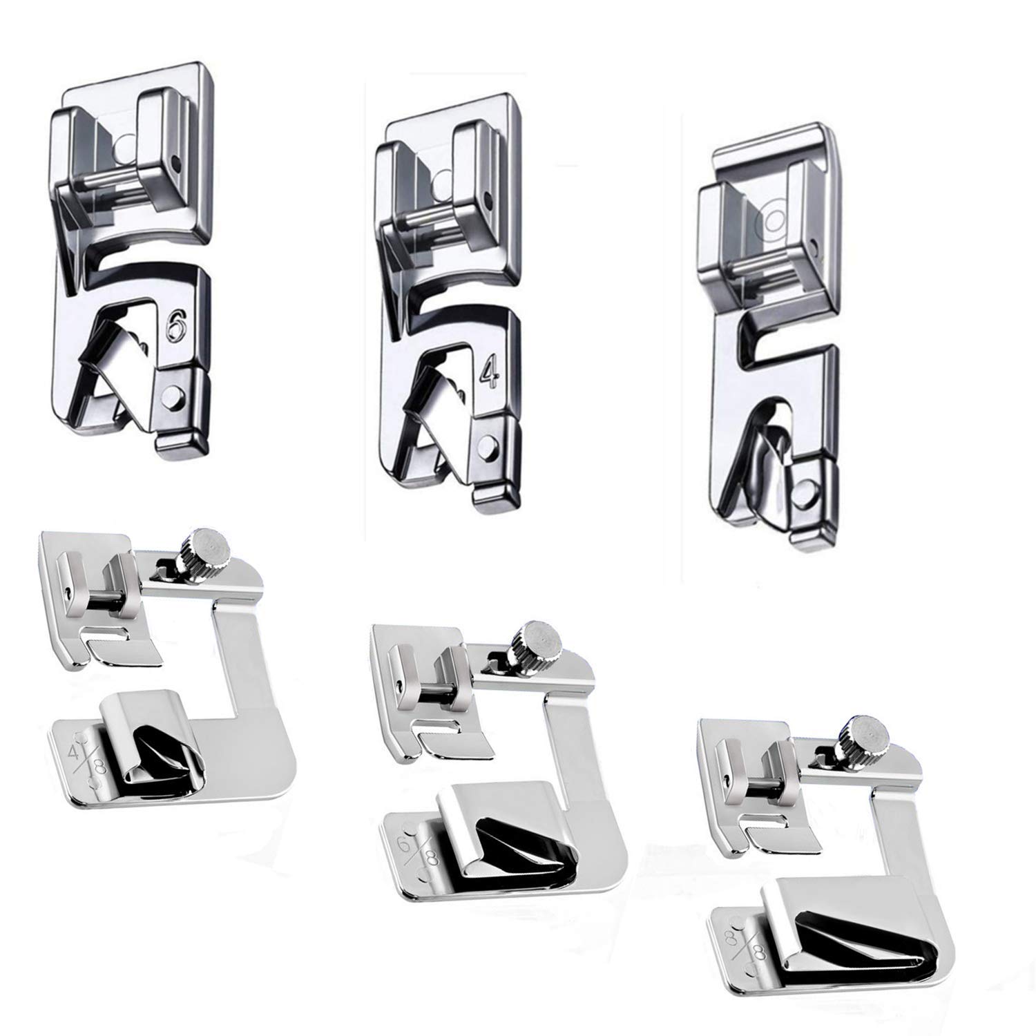 OUR SERVICE is always online for customers,if you feel not satisfied with this Brother Singer rolled hem foot set,just feel free to contact us,we'll try our best to solve the problem for you,so BUY IT WITH CONFIDENCE. WIDE&NARROW sewing foot hemmer set totally 6pcs comes in one package,when we hem some thicker fabrics or some more normal hems,instead of the narrow Singer hemming foot,we have wide hem presser foot for such as cotton skirt hemming projects. EASY HANDLING and widely used in kinds of hemming projects of fabrics with this hemming foot brother,The shape of the rolls in the hemmer foot make it very easy to fold the hem and they do grab the fabric very well so it isn't a pain to keep it lined up. LOW SHANK sewing machine can attach this feet rolled hem set,to measure your machine shank,just find the thumb screw that holds the foot on the machine and measure the distance from the center of screw to the sewing board,low shank has a 1/2 inch measurement. HEMMER FOOT is definately a useful tool for domestic fabric hemming,now you'll have a kit of 6pcs hemming foot with no time,package includes 3pcs wide rolled hem presser foot(4/8,6/8and 8/8 inch)and 3pcs narrow sewing foot hemmer(3,4 and 6mm).