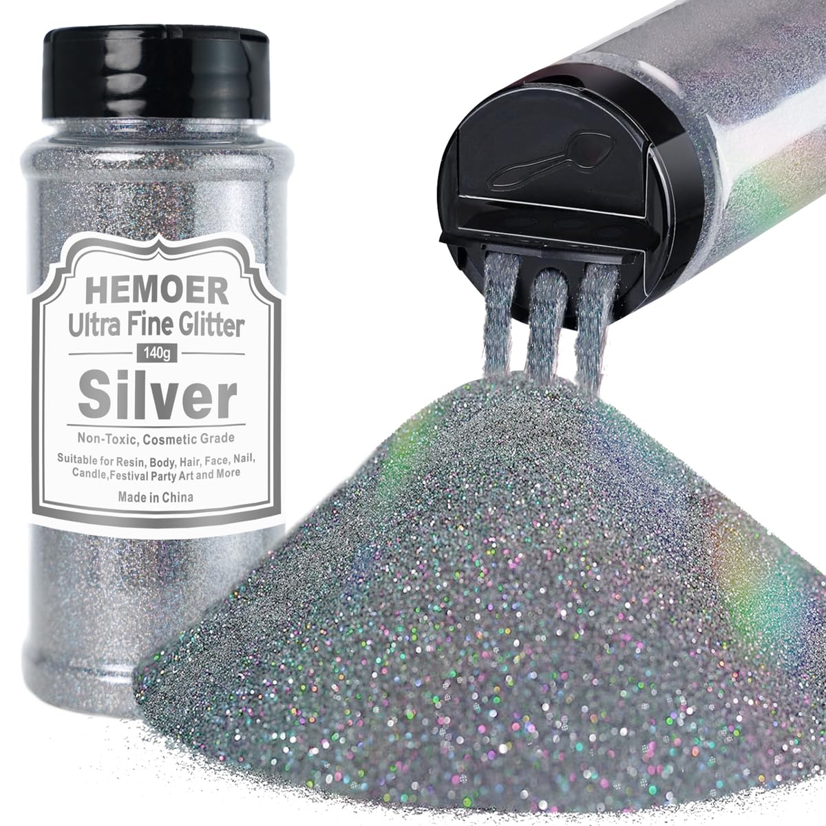 ?Easy to use: There are two types of shakers on the lid. One has a 3-hole design that helps to evenly sprinkle a small amount of flash powder and reduce waste. The other is semi-circular and can hold larger quantities, large enough to allow a small spoon to insert and remove the flash powder. The top of the bottle is sealed with aluminum foil, and the lid is sealed with foam to prevent leaks and keep the bottle in perfect condition. Safe ingredients: Our flash ingredients are safe for skin and nails and can be easily applied with flash glue or removed with a little water or fresh water. The beautiful nail glitter, body glitter, eyeshadow glitter, and face glitter are perfect for shaping your look for special occasions such as everyday life, weddings, parties, music festivals, and events. Perfect for Crafts and Cosmetic Decoration: This perfect glitter powder can be used to create sparkling jewelry, glitter keys, party decorations, and much more. It's also ideal for painting, card making, and scrapbooking. There are also nail glitters, body glitters, face glitters, eyeshadow glitters, cosmetic glitters, and more. Premium Extra Fine Glitter: These ultra-fine 0.2cm glitters are made of high-quality polyester, are odorless, and don't fade easily. They blend well with most DIY materials, such as epoxy resin, acrylic paint, glue, gel nail polish, etc., providing a natural, sparkling shine. Laser Silver Fine Glitter: This 140g bag of silver glitter powder is fully packed and supports many DIY projects. Create mesmerizing light effects in sunlight and other lighting to help you stand out! Maintains a lasting shine, ideal for crafts, epoxy art, nail art, cosmetics, etc.Argent Paillettes Ultra Fines, 140g en Résine Paillettes Métallique pour époxy, Gobelets, Bougies, Arts de la Peinture, Cheveux, Visage, Corps, Yeux, Nail art, Festival Argenté?Facile à utiliser: il existe deux types de shakers sur le couvercle, l'un est un design à 3 trous qui aide à saupoudrer uniformément une petite quantité de poudre flash et à réduire les déchets. L'autre est semi - circulaire et peut supporter de grandes quantités de verser, assez grand pour permettre à une petite cuillère d'entrer et d'enlever la poudre flash. Le Haut de la bouteille est scellé avec du papier d'aluminium et le couvercle est scellé avec de la mousse sans fuite et en parfait état. Sécurité des ingrédients: nos ingrédients Flash sont sûrs pour la peau et les ongles et peuvent être facilement appliqués avec de la colle flash ou éliminés avec un peu d'eau ou de l'eau douce. Les magnifiques paillettes pour les ongles, les paillettes pour le corps, les paillettes pour les ombres à paupières, les paillettes pour le visage sont parfaites pour façonner votre look lors d'occasions spéciales telles que la vie quotidienne, les mariages, les fêtes, les festivals de musique, les évé. Parfait artisanat et décoration cosmétique:La poudre scintillante parfaite peut être utilisée pour créer des bijoux scintillants, des clés scintillantes, des décorations de fête et bien plus encore. et idéales pour la peinture, la fabrication de cartes, le scrapbooking. il existe également des paillettes pour les ongles, des paillettes pour le corps, des paillettes pour le visage, des paillettes pour ombres à paupières, des paillettes cosmétiques, etc. Paillettes Extra Fines de Qualité Supérieure: Paillettes ultra fines de 0,2 cm, fabriquées en polyester de haute qualité, sans odeur, ne se décolorent pas facilement, peuvent bien se mélanger avec la plupart des matériaux de bricolage, tels que la résine époxy, la peinture acrylique, la colle, le vernis à ongles en gel, etc., apportent un éclat naturel et étincelant. Paillettes Fines Argentées Laser: Poudre de paillettes argentées de 140g, entièrement remplie, soutient de nombreux projets de bricolage.Créez des effets lumineux fascinants sous le soleil et la lumière pour vous démarquer! Maintient un éclat durable, idéal pour l'artisanat, l'art époxy, l'art des ongles, les cosmétiques, etc.