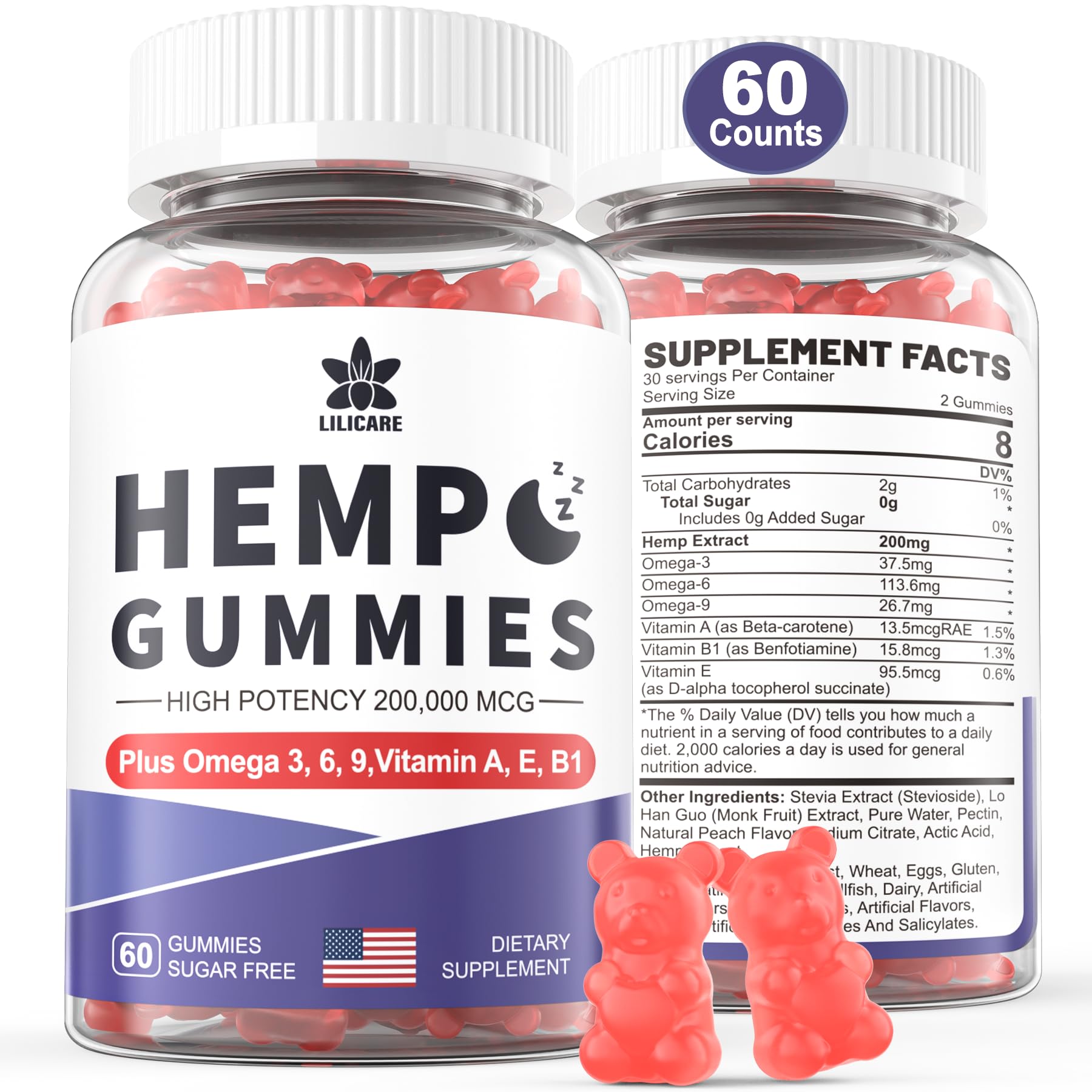 HIGH QUALITY: All of our gummies are manufactured, tested, and bottled in a GMP-certified factory for superior quality and consistency. NATURAL INGREDIENTS: Vegan, non-GMO, gluten-free, gelatin-free, soy-free,and no artificial flavors or colors. SUGGESTED USE: For adults, take 2 gummies daily or as directed by your healthcare professional. Plus Omega 3 6 9, Vitamin A E B1. Hemp Gummies 200mg : 30servings,2 gummies per serving.
