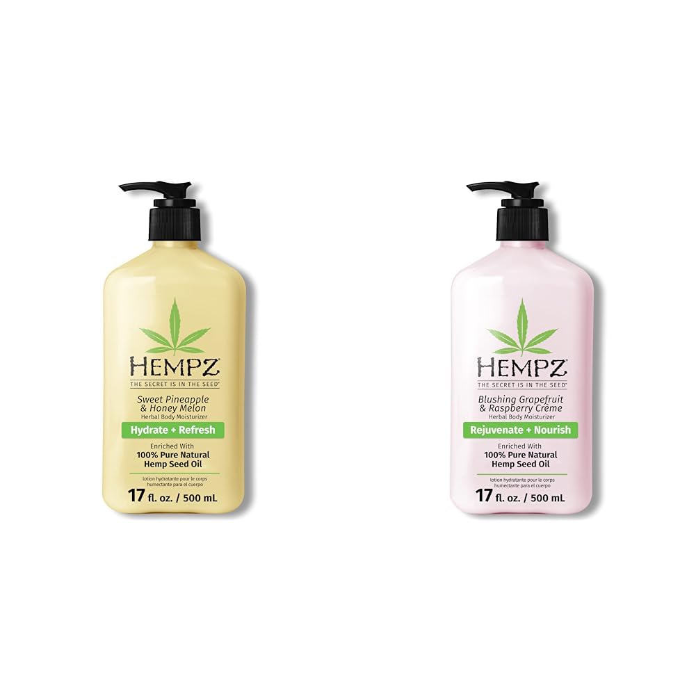 100 VEGAN: Both body moisturizers are completely vegan and free of THC. LONG-LASTING MOISTURE: Provide all-day hydration with over 29oz of paraben-free and gluten-free body lotion. ESSENTIAL VITAMINS: Vitamins A, C, and E help replenish, nourish, and protect skin from free radicals. OIL RICH FORMULAS: Hemp Seed, Jojoba Seed, and shea butter enrich, heal, and even skin tone across both lotions. SOOTHING HYDRATION: Pineapple and Honey Melon extracts condition, soften, and hydrate your skin with 17oz of body lotion.