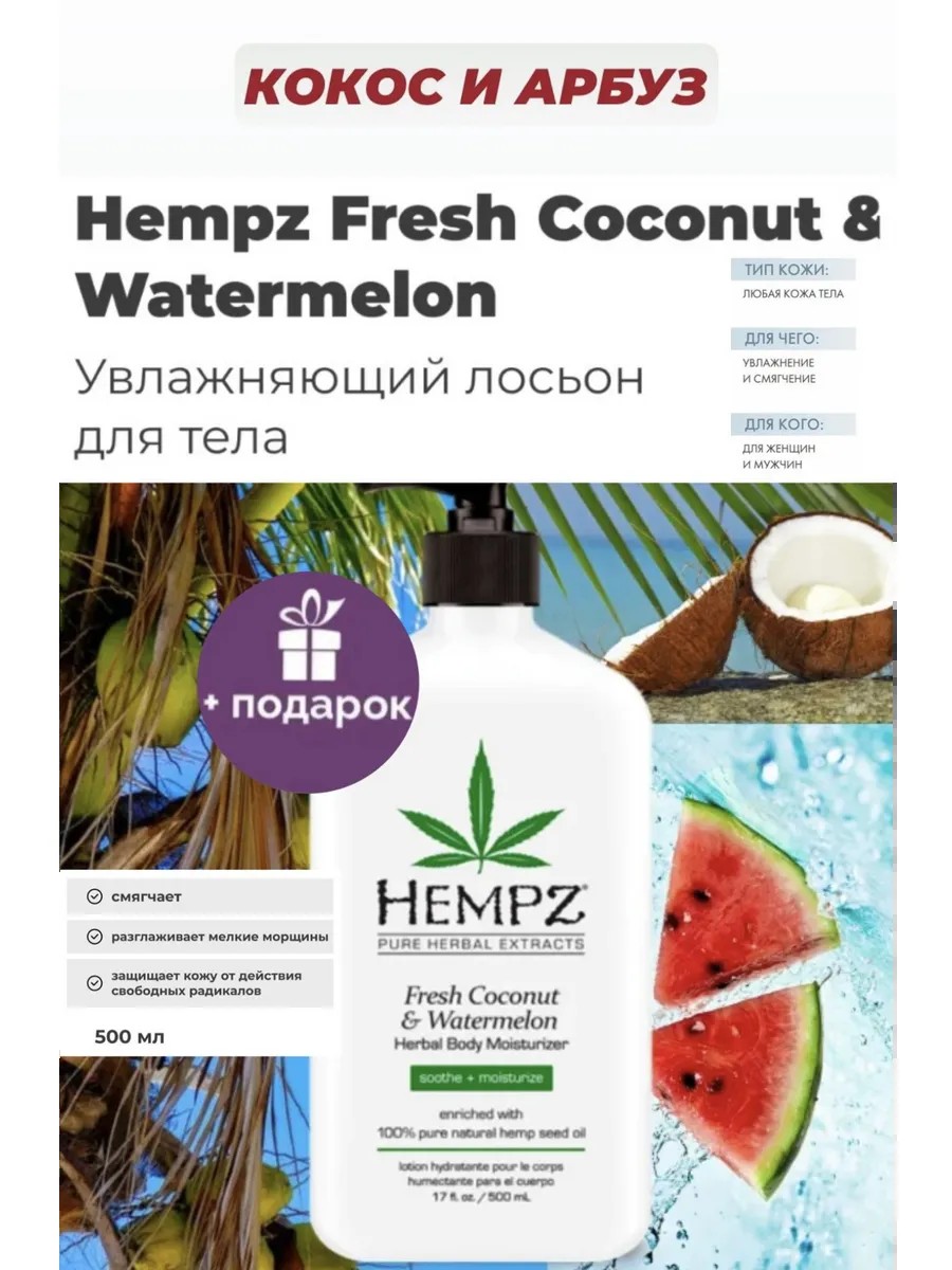 Опробуйте освежающий лосьон для тела «Кокос и арбуз» от Hempz. Ваша кожа станет шелковистой и упругой как у младенца, обретет свежесть, неувядаемую красоту и волшебный аромат!