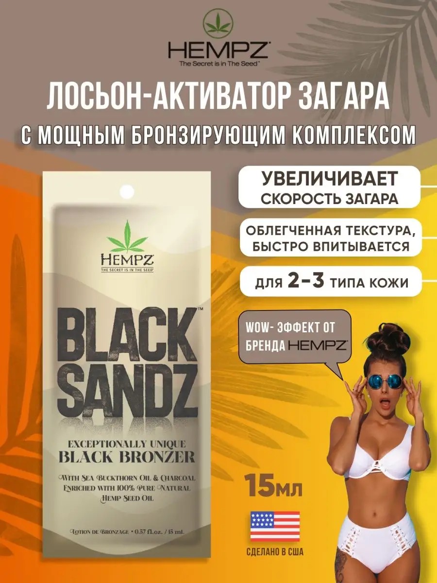 A unique activating lotion with a powerful bronzing complex, Black Sandz, from Hempz. Black Bronzers: a blend of DHA, Erythrulose, and ultra-powerful natural bronzers. Contains a unique delivery system for an instant, stunning dark shade. The effect lasts for 2-3 days.
