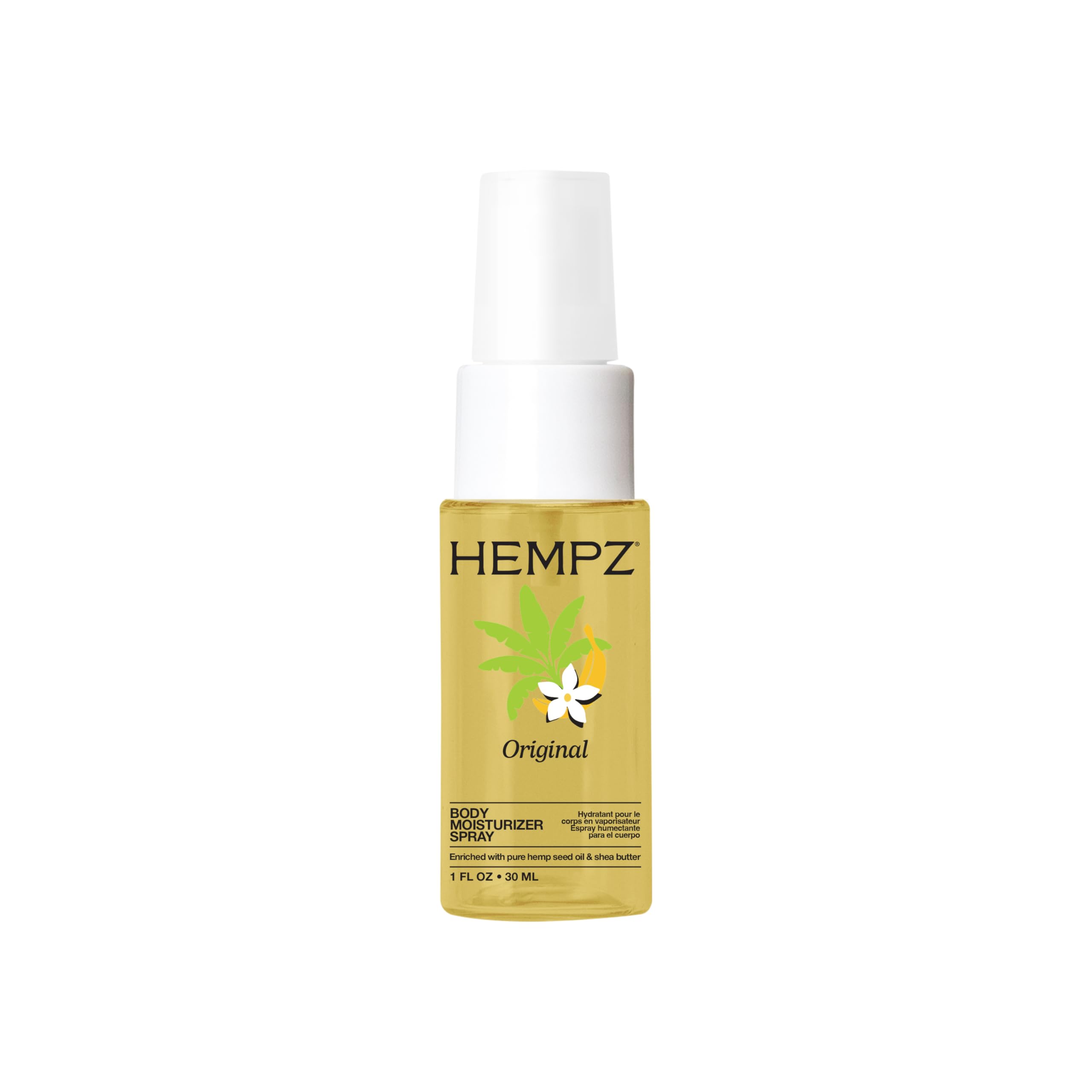 HEMPZ CONSCIOUS CHOICE: Vegan, Cruelty-Free, and Free from alcohol, phthalates, and parabens. NON-GREASY: Our light weight, quick absorbing, formula will leave your skin feeling nourished without a greasy film. KEY INGREDIENTS: Ginger Root Extract calms skin Glycerin and Hemp Seed Oil retain and draw moisture. ICONIC AROMA: Experience the iconic fragrance of tropical banana, plumeria, and pineapple that started it all. ALCOHOL FREE: Meet the iconic scent that started it all with Hempz Original Body Moisturizer Spray! This ultra-light, fast-absorbing spray hydrates with a gentle, alcohol-free formula. Crafted with Ginger Root Extract, Hemp Seed Oil, and Shea Butter to replenish moisture while leaving it soft and smooth in a convenient 1 ounce size.