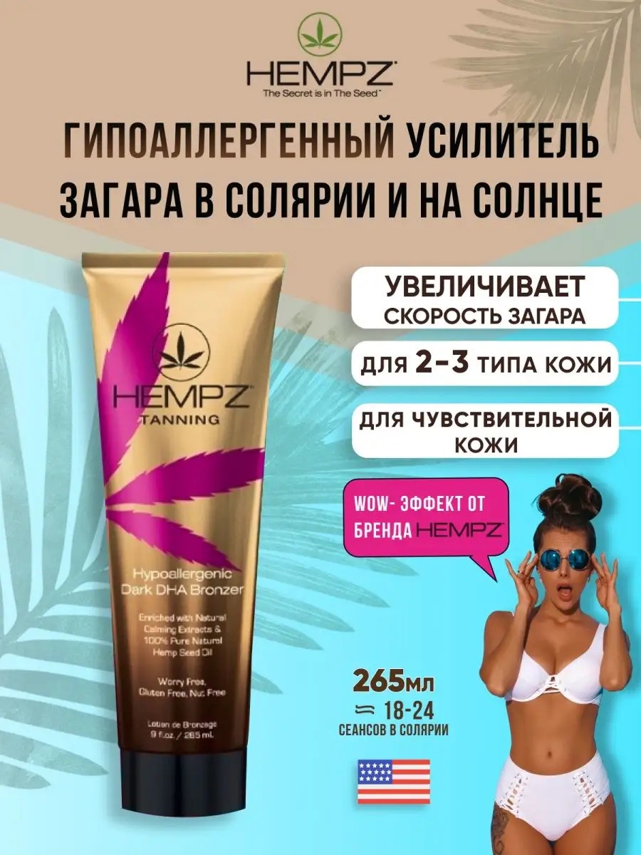 Is your skin sensitive to tanning lotions and other cosmetics in general? The Hypoallergenic line from Hempz professional skincare is your savior! It's designed specifically for women prone to allergic reactions. This moisturizing tanning accelerator for instant tanning of the face and body in a tanning bed features a hypoallergenic formula free of gluten, nuts, and parabens and is suitable for all skin types. This protective tanning cream contains a complex of natural bronzers and DHA, which provide a dual effect: a golden, natural shade appears immediately and darkens further after a tanning session in a tanning bed or in the sun for several hours. Thanks to the natural body oils made from Hemp and Mango seeds, the bronzer is also ideal for body care: it moisturizes and nourishes, makes skin firm and elastic, and locks in the desired tone. The tanning treatment also contains soothing, softening extracts designed to prevent redness and irritation. Apply the tanning activator immediately before tanning, to clean, dry skin, after a shower. The hypoallergenic cream and lotion with oils will ensure the safety of your skin.