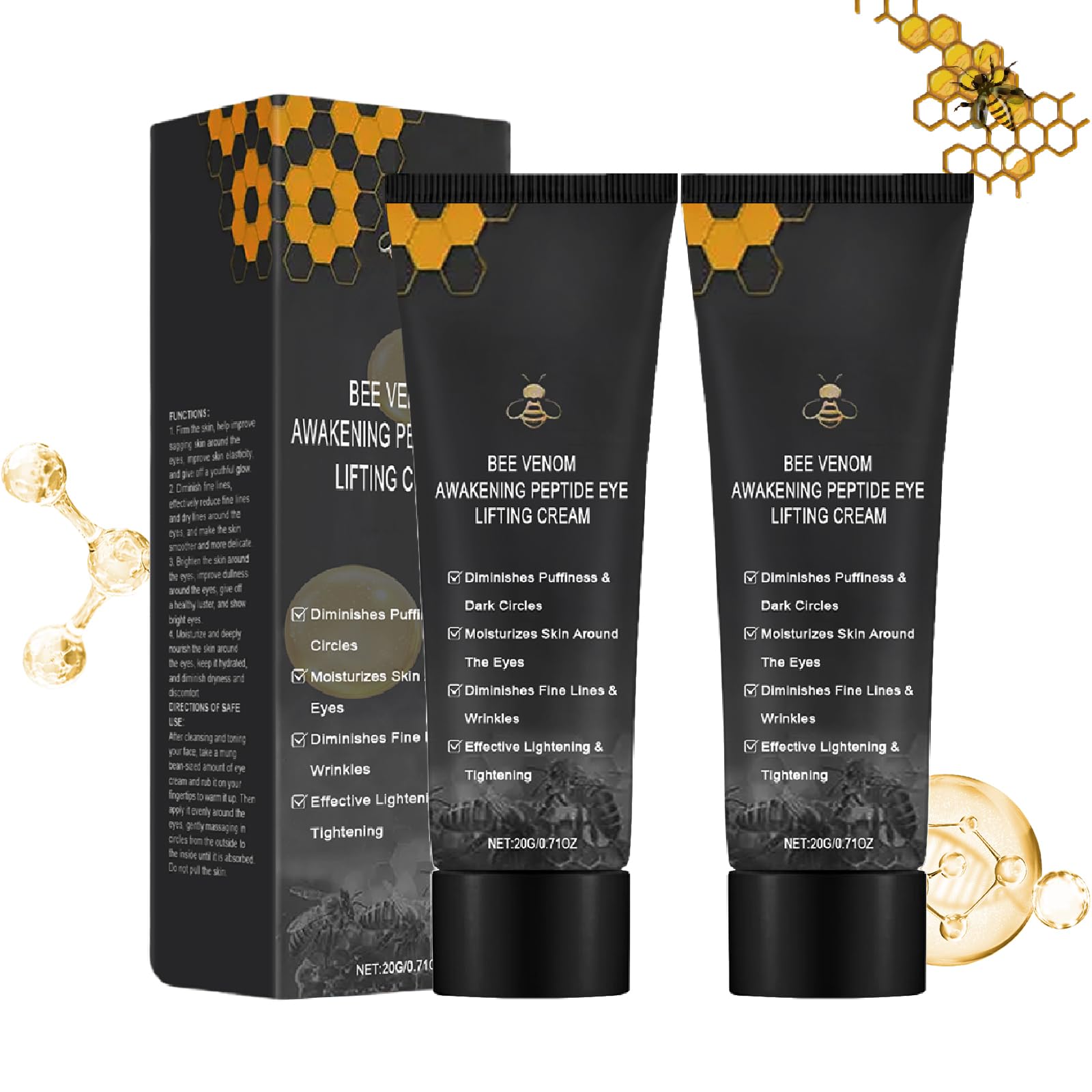 : Bee Venom Eye Firming Cream - Relieves Under-Eye Puffiness - Eye Firming Cream - Treats Dark Circles and Puffiness - Vegan Eye Cream - For Sensitive Skin - Eye Firming Serum - Travel Size Specifications: Name: Bee Venom Awakening Peptide Eye Lifting Cream Net Contents: 20 g 0.71 fl oz Product Weight: 41 g Shelf Life: 3 years Package Contents: Pack of 1, 2, or 4 Bee Venom Awakening Peptide Eye Lifting Creams Note: 1. Please allow slight measurement errors due to manual measurement. 2. Due to differences in monitor settings and lighting, the actual color of the item may vary slightly from the image shown. Please refer to the actual product. 3. If you have any questions, please feel free to contact us. We will provide you with the most satisfactory solution within 24 hours. SAFETY WARNING Store in a cool, dry place away from sunlight. Keep out of reach of children.