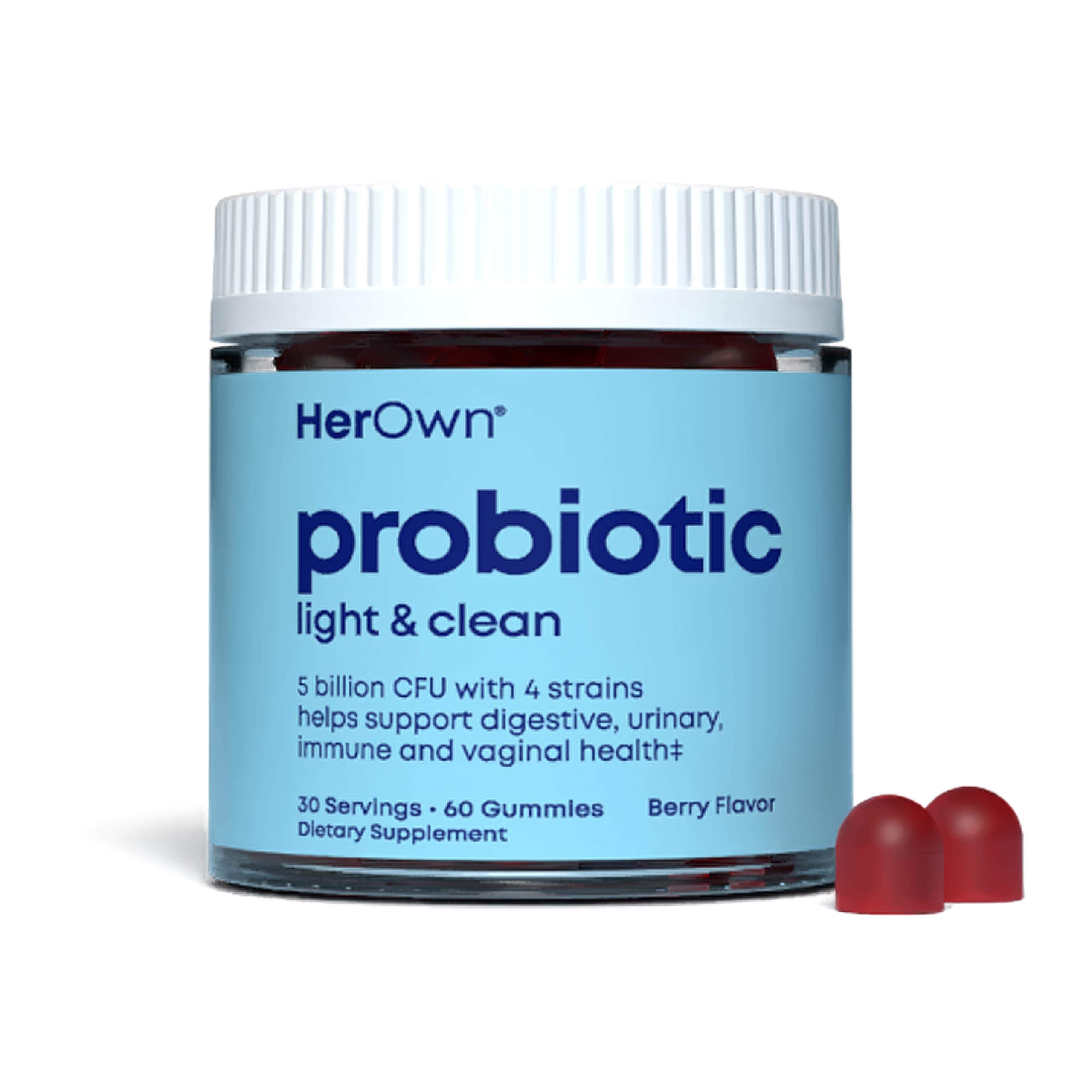 Unit count: 60.0. ABOUT HER OWN. Created for today's woman, her own is a collection of modern health supplements formulated for your unique health needs. It's your wellness journey. Own it. EVERYTHING YOU WANT. NOTHING YOU DON'T. her own supplements are formulated using only the finest ingredients. her own Probiotic Gummies are vegan, non-GMO, gluten free and soy free, with no synthetic colors or preservatives. APPLE CIDER VINEGAR FOR FLUID BALANCE, TOO. The pectin found in apple cider vinegar may help reduce bloating and promote healthy pH balance. That's why it provides additional gut health benefits for her own Probiotic Gummies. BEET FOS PREBIOTIC FIBER TO "FEED" GOOD BACTERIA. For long-term gut health, you have to feed the healthy probiotics in your intestines. her own Probiotic supplies 300 mg of fructooligosaccharide prebiotic fiber from beets to support a healthy digestive system. 5 BILLION CFU OF 4 PROBIOTIC STRAINS. her own Probiotic Gummies provide 5 billion CFU (live cells) of 4 key complementary strains of probiotic flora. These include providing widely researched Lactobacillus casei, Lactobacillus plantarum, Lactobacillus acidophilus and Bifidobacterium bifidum. DIGESTIVE HEALTH, BEAUTIFUL SKIN, IMMUNE SUPPORT. To support all of these critical health systems, your body relies on a strong microbiome that's flush with healthy bacteria. her own Probiotic Gummies supports your daily digestive system maintenance in two delicious natural Berry flavor gummies.
