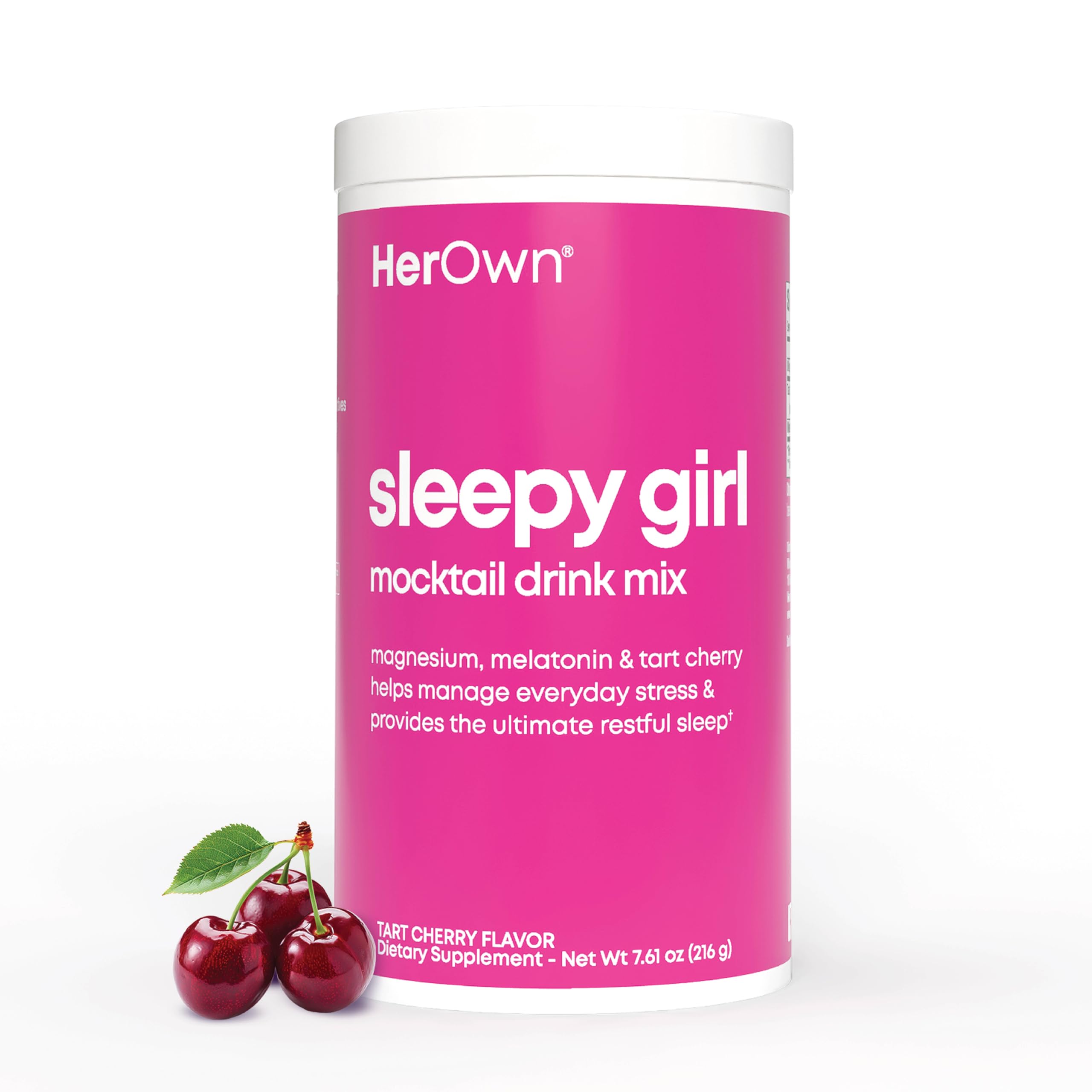 Her Own Sleepy Girl is a carefully crafted blend of magnesium, melatonin, and tart cherry designed to help women achieve deep, restful sleep. This powerful formula works in harmony to support your body's natural sleep cycles, allowing you to fall asleep faster and stay asleep longer, ensuring a night of uninterrupted rest. The calming properties of magnesium, along with the sleep-enhancing benefits of melatonin and tart cherry, help to create a soothing environment that naturally eases you into sleep without struggle. With the added benefits of tart cherry, which contains natural melatonin, Her Own Sleepy Girl offers a gentle and effective alternative to sleeping supplements, helping to balance sleep patterns and keep your internal clock in sync. Magnesium also plays a key role in eg muscles and relieving physical tension, which can prevent discomfort and restlessness, allowing you to fall asleep peacefully and stay asleep throughout the night. Most importantly, you'll wake up feeling refreshed and energized, free from the grogginess often associated with traditional sleep medications. Her Own Sleepy Girl provides a safe and natural way to improve your sleep and support your overall well-being. Created for today's woman, Her Own is a collection of modern health supplements formulated to meet your unique needs, empowering you to take control of your wellness journey. Own it.ABOUT HER OWN. Created for today's woman, her own is a collection of modern health supplements formulated for your unique health needs. It's your wellness journey. Own it. WAKE UP REFRESHED AND ENERGIZED. Thanks to its unique blend of ingredients, Her Own Sleepy Girl helps you sleep soundly without leaving you feeling groggy in the morning. You'll wake up feeling rested, rejuvenated, and ready to take on the day, all without the unwanted side effects often associated with traditional sleep medications. MAGNESIUM FOR MUSCLE RELIEF. Magnesium is essential for maintaining a balanced body and brain, and Her Own Sleepy Girl helps alleviate physical tension, eg muscles before bed. This helps prevent those restless nights caused by muscle discomfort, allowing you to fall asleep peacefully and stay asleep through the night. NATURAL SLEEP SUPPORT. With the added benefits of tart cherry, which naturally contains melatonin, Her Own Sleepy Girl offers a gentle yet effective alternative to faster sleep. This all-natural combination promotes balanced sleep patterns and helps your body's internal clock stay in sync, making it easier to drift off to sleep and wake up feeling refreshed. SUPPORTS CALMNESS. The calming properties of magnesium, combined with the sleep-enhancing benefits of melatonin and tart cherry, work together to soothe you into a calmness. This formula helps create the perfect environment helping you wind down naturally and ease into a restful sleep without the struggle. PROMOTES RESTFUL SLEEP. Her Own Sleepy Girl combines a powerful blend of magnesium, melatonin, and tart cherry to help women experience deep, uninterrupted sleep. This carefully selected formulation works in harmony to support your body's natural sleep cycles, allowing you to fall asleep faster and stay asleep longer, ensuring a restful night's sleep every time.