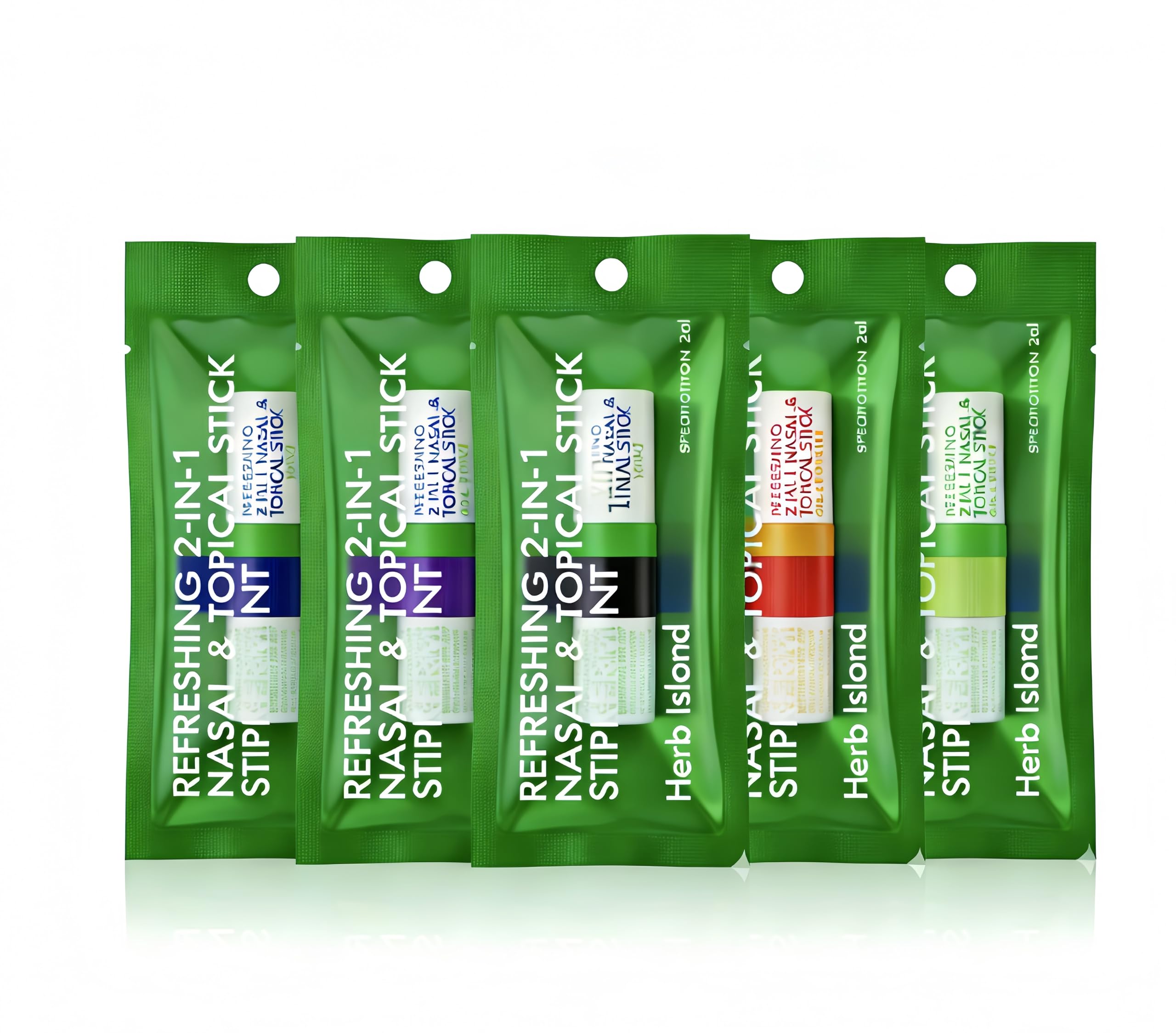 Smart Lifestyle Solution:More than just nasal sticks for breathing, this herb island inhaler serves as organic respiratory support. Apply the topical stick to temples for aromatherapy, or use the nasal smelling stick component for sinus relief - your all-day nasal stick energy source. 5 Therapeutic Aromas:Choose from refreshing 2 in 1 tropical stick variants: Grapefruit for focus, Green Grape for mood lift, or Mint for instant revival. Each essential oil nasal inhaler blend uses plant-derived actives to naturally sharpen mental clarity and purify personal air space. Instant Energy On-The-Go:Compact 2.36-inch cool nasal inhaler fits in any pocket. Use this ultra-portable nasal stick for concentration boosts at work, or as a nose sniffer stick to wake up during travel. Your multi-use wellness companion for offices, flights, and outdoor adventures. Botanical Respiratory Support:Formulated with plant-powered menthol eucalyptus, this natural nasal stick acts as a nasal decongestant without synthetic additives. The essential oil vapor inhaler pen mechanism provides gentle yet strong nasal inhaler 2 in 1 rub effect for clearer breathing during allergy season or for flu. Dual-Channel Relief System:Experience innovative 2 in one nasal and topical stick technology: Inhale through the nasal inhaler for instant congestion relief, while the essential oil-infused roller applies to pulse points. This herbs island 2 in 1 nasal stick design delivers double-action freshness to combat drowsiness and mental fog.
