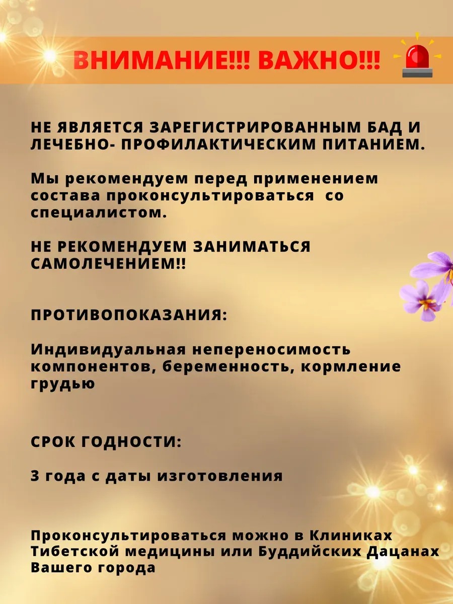 According to Tibetan medicine, Sampel Norbu is effective for white channel diseases such as atherosclerosis of the cerebral and cardiac vessels, dizziness, memory impairment, paresis, paralysis, gout, leprosy, rheumatism, joint stiffness and pain, memory loss, loss of sensation in the extremities, numbness, and nervous tics. It helps with pinched nerves, herniated discs, and bone problems; it restores ligaments and tendons. It helps improve cerebral circulation, the conduction of nerve impulses, and blood and energy circulation throughout the body. We produce Samnor with an original composition based on the recipe of the Atlas of Tibetan Medicine in the Republic of Buryatia with the support of the Ivolginsky Datsan. This herbal remedy is a conscious choice for your peace of mind and health! Release form: pills (peas). The mixture should be taken orally with warm water. Chew or crush the pills before use. A course of Eastern Medicine herbal remedies is always designed for 21 days. The dosage and time of administration are determined individually by a Tibetan Medicine doctor or Emchi Lama, who conducts consultations at Tibetan Medicine clinics and Buddhist datsans in your city. Consult a specialist before use! Contraindications: Epilepsy, individual intolerance to the product's components. Directions for use: 2 pills per day (pack of 42), 1 pill (pack of 21), before bedtime, or as directed by a doctor.
