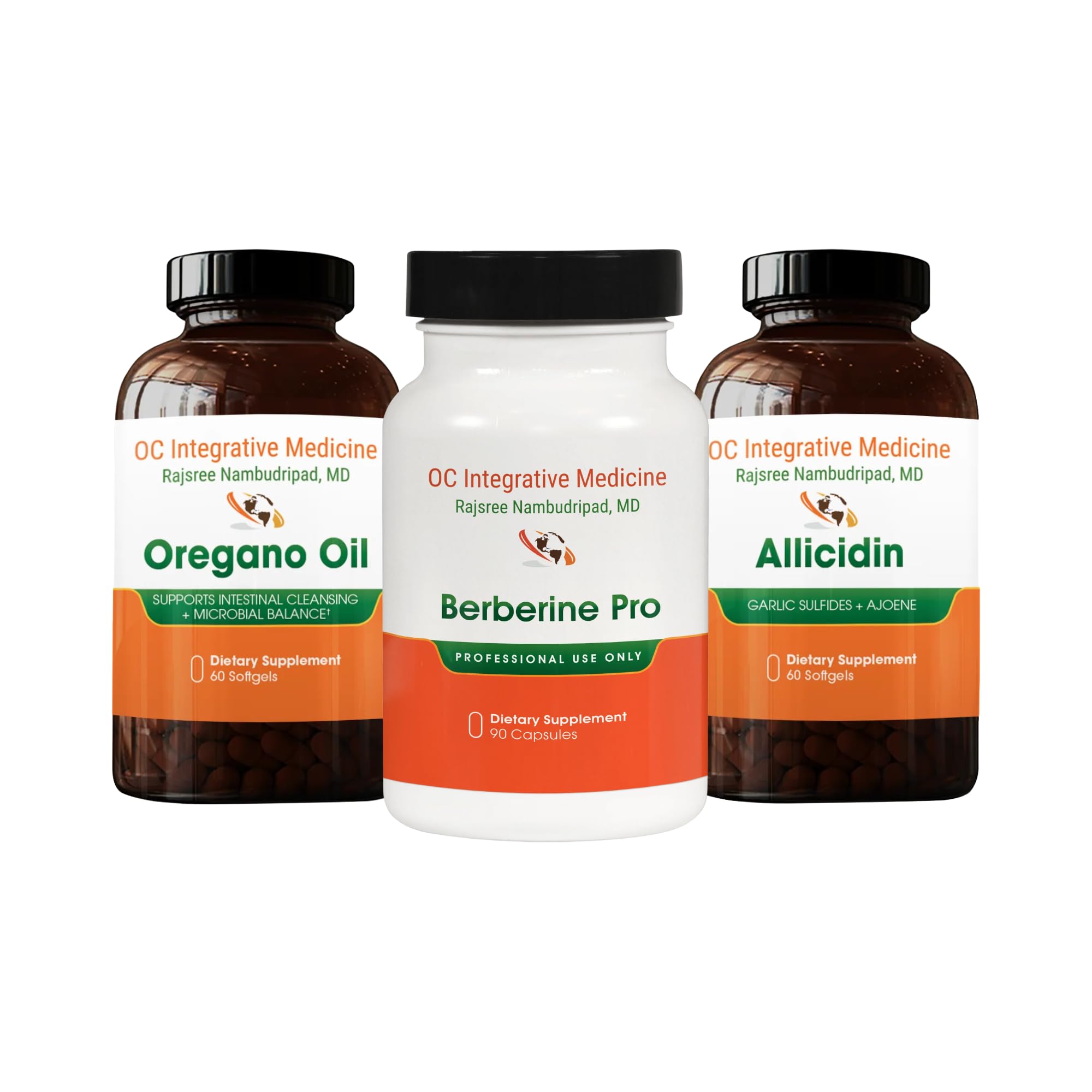 This Herbal Bundle by Dr. Rajsree contains one bottle of Oregano Oil, 60 Softgels, one bottle of Allicidin, 60 Softgels, and one bottle of Berberine Pro, 90 Capsules.