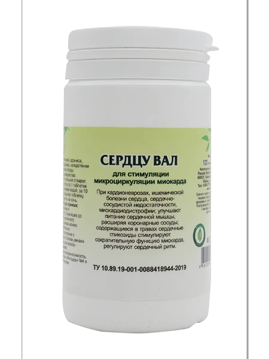 The herbal collection "VAL for the Heart" (90 tablets) is used for cardiac neuroses, coronary heart disease, cardiovascular insufficiency, and myocardial dystrophy; it improves the nutrition of the heart muscle by dilating the coronary vessels; the cardiac glycosides contained in the herbs stimulate the contractile function of the myocardium and regulate the heart rhythm.