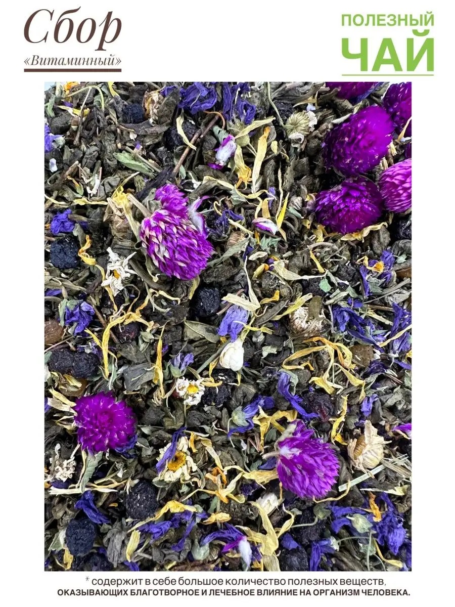 Tea made from garden or wild plants not only adds variety to your diet but also improves your health. Plants that can be brewed into tea have a variety of medicinal properties, and you can add the one that suits your taste and health benefits perfectly. There are dozens, even hundreds, of herbs that are beneficial for tea, and in our collection, we offer a list of the most useful and popular ones. It is important to prepare any herbal or fruit-berry tea correctly, adhering to the rules for its consumption. Only then can you be sure of a positive effect, preserving the beneficial substances, taste, aroma, and color of the drink. Ingredients: Chinese green tea, chamomile, chokeberry, mint, thyme, calendula, raisins, cherry, hawthorn, jasmine, calendula, mallow, gomphrena. Directions: 1-2 teaspoons. Pour a glass of boiling water over the mixture. You can cool and strain the infusion or drink it hot like tea. The tea is sold in bags. The polymer material BOPP (biaxially oriented polypropylene, BOPP) is produced exclusively from virgin raw materials, allowing the bags to be used for any food product. We recommend using paper bags for storing the mixture.