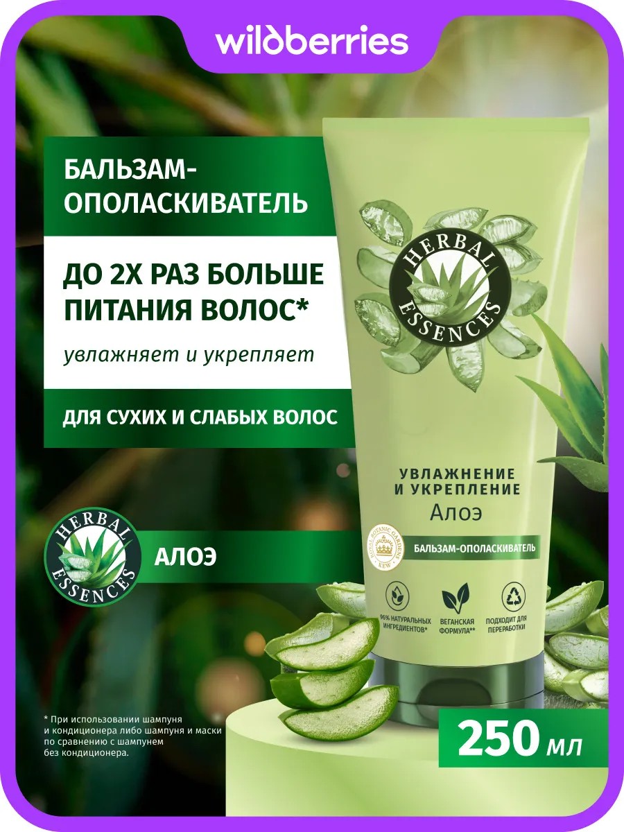 Окунитесь в природный оазис вместе с Herbal Essences. Бальзам-ополаскиватель Herbal Essences Алоэ Увлажнение и Укрепление питает сухие волосы, а нежный жасминовый аромат помогает почувствовать себя в тонусе. Cмесь растительных питательных нутриентов и алоэ из Южной Мексики подарят увлажнение и легкое расчесывание волосам. Уникальная технология бальзама-ополаскивателя позволяет использовать средство 2 способами: смываемое (нанесите от середины длины до кончиков, затем смойте) и несмываемое (нанесите от середины длины до кончиков и оставьте на волосах). Мы тщательно отбираем ингредиенты природного происхождения, чтобы привнести силу растений в вашу ванную комнату. Восстановите природную красоту волос и превратите уход за волосами в момент наслаждения вместе с коллекцией Алоэ Увлажнение и Укрепление. Веганская формула, не содержит сульфатов* (*без сульфатосодержащих поверхностно-активных веществ).