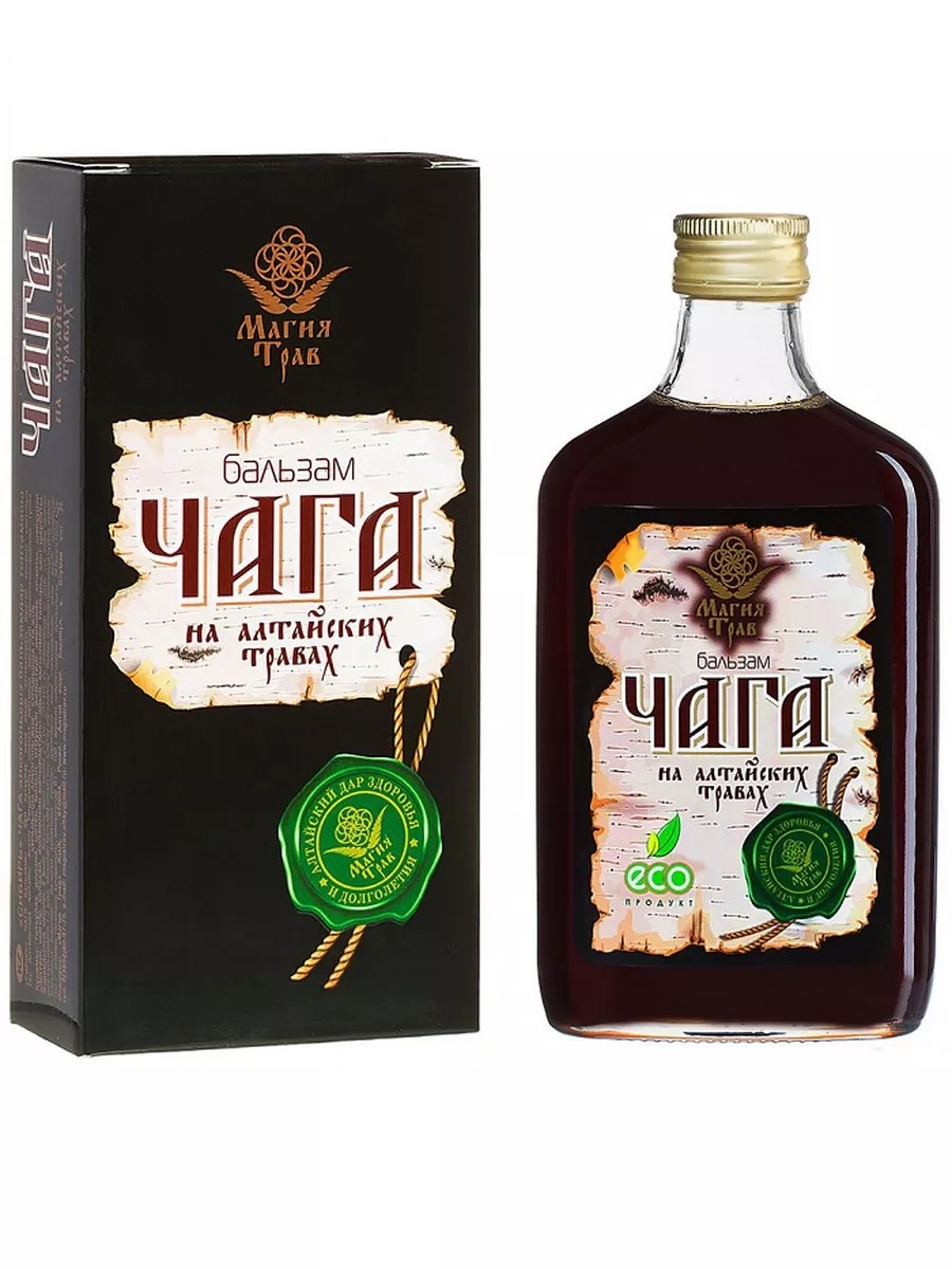 Бальзам «Чага» - это натуральный концентрированный настой на основе гриба чаги и дикорастущих лекарственных трав Горного Алтая. Содержит богатый комплекс целебных веществ, обладает мощными оздоравливающими, общеукрепляющими и профилактическими свойствами. Рекомендуется в качестве средства профилактики онкологических заболеваний, нормализации обмена веществ и работы желудочно-кишечного тракта, а также повышения защитных сил организма и качества жизни.Чага (чёрный берёзовый гриб) - используется в медицине в качестве природного противоопухолевого средства, применяется при хронических гастритах, дискинезиях желудочно-кишечного тракта и язвенной болезни желудка. Назначается при злокачественных опухолях, когда не рекомендуется лучевая терапия и хирургическое вмешательство (улучшает самочувствие больных). Настои и отвары чаги обладают общетонизирующим свойством, активизируют защитные силы организма, являются эффективным природным средством профилактики окнкозаболеванийСостав: Чага, плоды боярышника, плоды рябины, плоды черемухи, плоды шиповника, трава горца птичьего, трава душицы, трава зверобоя, лист бадана толстолистого, лист крапивы, лист подорожника, корень аира, корень солодки, сахарный сироп.