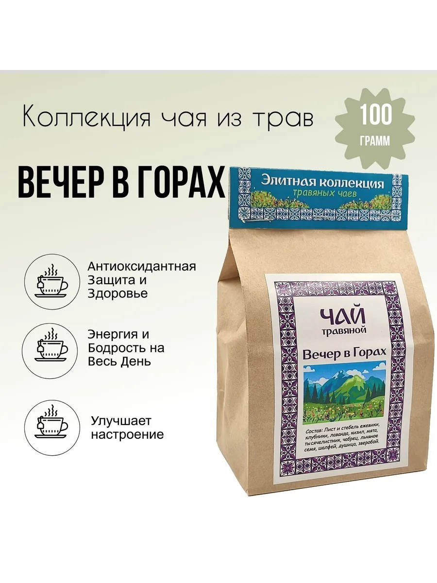 Травяной чай "Вечер в горах" — это богатый листовой чай с уникальным составом из целебных горных трав, таких как мята, лаванда, тысячелистник, чабрец, шалфей и душица.Натуральный чай для тех, кто ценит лечебный чай и полезные травы для поддержки здоровья, очищения и укрепления организма. Этот фиточай оказывает желчегонное и очищающее действие, поддерживает функции печени, желчного пузыря и поджелудочной железы, помогая нормализовать обмен веществ и улучшить общее самочувствие.В составе чая также льняное семя, которое способствует расщеплению жиров, и шиповник для выведения шлаков и токсинов. Такой лечебный сбор особенно полезен для поддержания веса, очищения организма и повышения жизненного тонуса. Сбор целебных трав мягко успокаивает, помогает расслабиться и поддерживает иммунитет.Этот натуральный травяной сбор — идеальный выбор для тех, кто ищет оздоровительный чай или чай для здоровья, который поддерживает пищеварение, обмен веществ и укрепляет иммунную систему. Благодаря натуральным компонентам, чай служит источником витаминов, органических кислот и антиоксидантов. Чай для иммунитета и для укрепления организма, такой как "Вечер в горах," — это отличное решение для поддержания энергии и бодрости.Горный фиточай подойдёт и как чай для очищения организма и детокса, поскольку помогает избавляться от вредных веществ и нормализует водно-солевой баланс. Если вы ищете травяной напиток для поддержания здоровья, восстановления сил и иммунитета, этот чай для расслабления и обмена веществ станет для вас отличным выбором.Купить травяной горный чай "Вечер в горах" можно для ежедневного употребления и улучшения самочувствия. В нём натуральные горные травы сочетаются с чабрецом и душицей, делая этот органический травяной чай полезным и ароматным. Этот чай для очищения и детокса идеально подходит для поддержания здоровья, укрепления иммунитета и насыщения организма натуральными веществами.