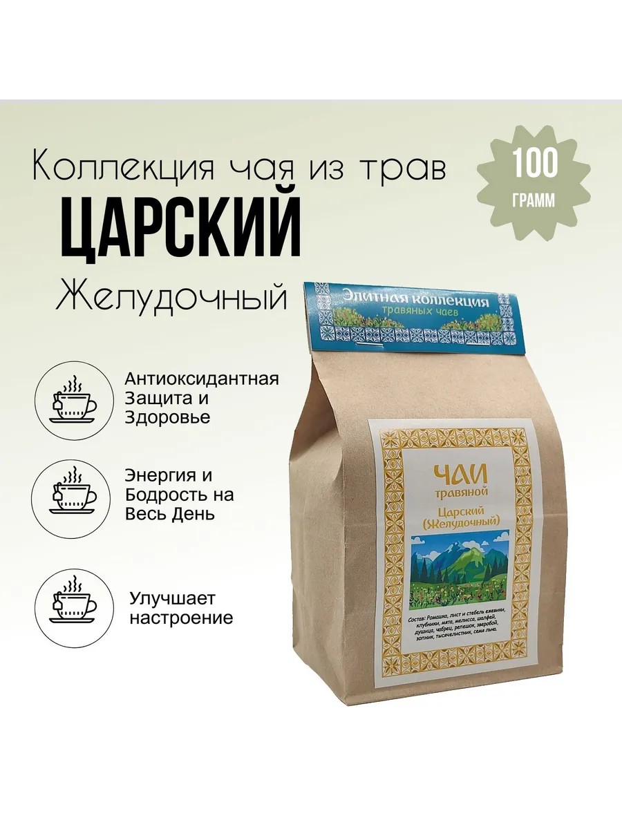Травяной чай «Царский (Желудочный)» — это уникальный листовой чай, созданный для поддержания здоровья и укрепления организма. В его состав входят натуральные компоненты: ромашка, лист и стебель ежевики, клубники, мята, мелисса, шалфей, душица, чабрец, репешок, зверобой, зопник, тысячелистник и семя льна. Такой сбор целебных трав известен своим благотворным воздействием на пищеварительную систему. Тысячелистник помогает улучшить работу ЖКТ, ромашка обладает противовоспалительным эффектом, а семена льна создают защитный обволакивающий слой, успокаивая слизистую.Этот натуральный травяной сбор идеально подходит для тех, кто хочет укрепить иммунитет и поддерживать здоровье. Фиточай «Царский» стимулирует обмен веществ, обладает желчегонным действием и способствует очищению организма от токсинов. Его регулярное употребление помогает снять напряжение, улучшить общее самочувствие и поддержать работу пищеварительного тракта. Такой лечебный чай из горных трав — это не только оздоровительный напиток, но и эффективное средство для детокса и восстановления.Ищете, где купить травяной горный чай? Этот полезный чай из горных трав станет незаменимым помощником для вашего организма. Он содержит ценные целебные травы, такие как чабрец и душица, которые поддерживают иммунитет, снимают воспаление и способствуют расслаблению. Пейте чай для укрепления иммунитета и тонуса, наслаждайтесь оздоровительным чаем с натуральными ингредиентами и заботьтесь о своем здоровье.Органический травяной чай «Царский» — выбор для тех, кто ценит натуральность и качество. Он поддерживает пищеварение, укрепляет организм, помогает при стрессе и усталости. Травы для иммунитета, входящие в состав, делают его идеальным для холодного времени года и восстановления сил.