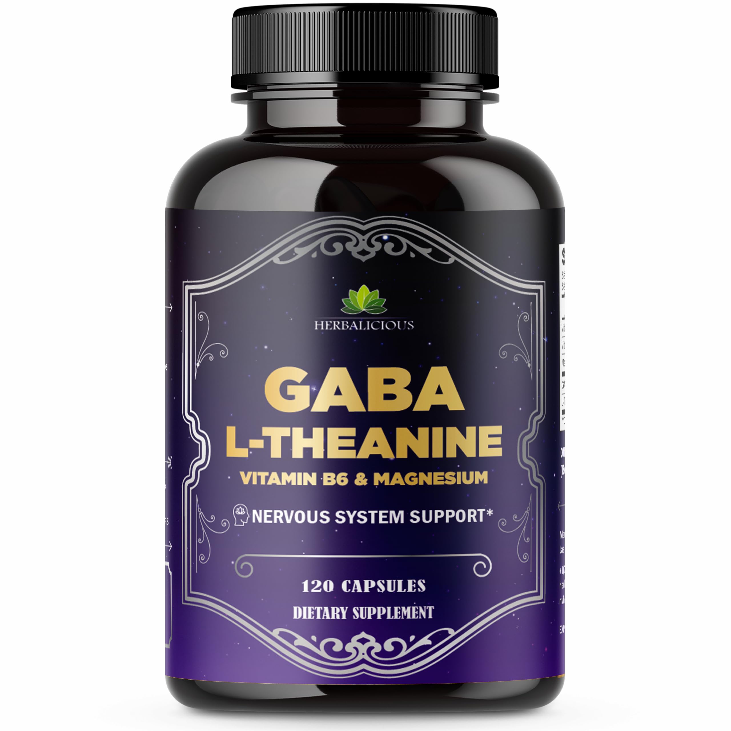 HERBALICIOUS GABA L-Theanine with Magnesium Calm & Focus Support Stress Relief Relaxation + Mood Balance Brain & Memory Support Supplement Vitamin B6 + B12 Complex 120 Capsules