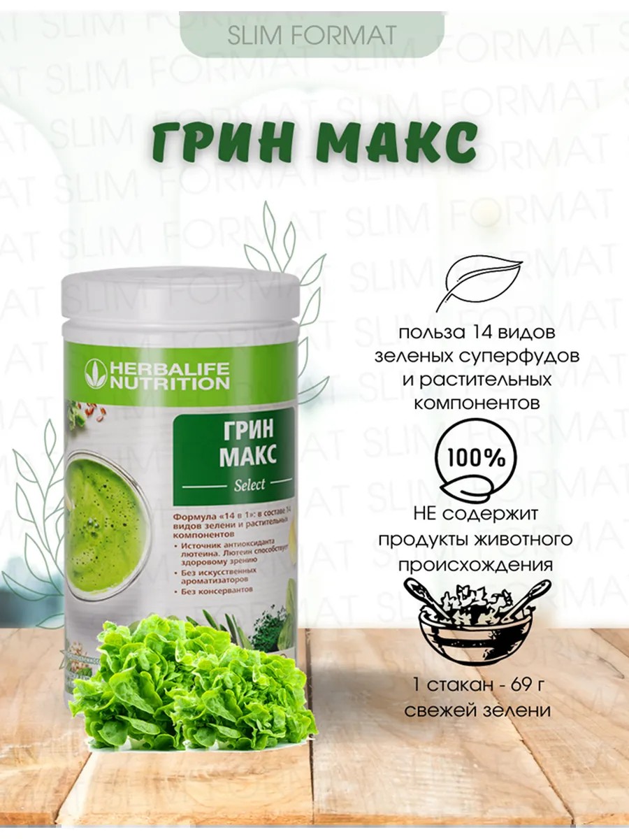 Мы понимаем, что ввести достаточное количество растительных компонентов в свой рацион бывает сложно. Чаще всего приходится обходиться несколькими видами овощей. Поэтому мы разработали Грин Макс Select, который включает в себя 14 растительных компонентов. Его можно использовать как самостоятельный продукт, добавлять в Протеиновый коктейль Формула 1 или другой ваш любимый напиток Herbalife и получать всю пользу зелени и суперфудов. Шпинат, Кейл, Брокколи, Ростки пшеницы, Ростки ячменя, Хлорелла, Спирулина, Имбирь, Куркума, Семена льна, Овсяные пищевые волокна, Яблочные пищевые волокна. С растительной пищей организм получает антиоксидант лютеин, который обеспечивает поддержку нормального функционирования глаз, остроты и ясности зрения. Чтобы вы могли иметь доступ к зелени, мы разработали Грин Макс Select. 14 видов растительных ингредиентов и суперфудов в одном стакане — источнике лютеина, альфа-леноленовой кислоты, а также железа в любое время года. БАД. Не является лекарственным средством. Не секрет, что здоровье глаз зависит от образа жизни и рациона питания. Позаботиться о вашем зрении поможет наша зелёная новинка — Грин Макс Select. Откройте для себя суперфуд в мире протеиновых коктейлей с Грин Макс от компании Herbalife! Этот белковый коктейль является настоящим кладезем питательных веществ и идеальным спортивным питанием для вашего здоровья. Спирулина и хлорелла – уникальное сочетание, которое обеспечивает очищение организма и поддерживает общее здоровье. Спирулина порошок и спирулина витамины в составе коктейля обогащают ваш организм необходимыми питательными элементами, а спирулина в таблетках для похудения поможет достичь вашей желаемой формы. Интегрированная хлорелла спирулина способствует улучшению пищеварения и снабжает организм полезными веществами, которые поддерживают общее благополучие. В составе Зеленого коктейля Грин Макс также присутствует соевый белок – отличный выбор для тех, кто стремится к похудению и заботится о своем здоровье. Соевый белок для похудения и изолят соевого белка обеспечивают ваш организм важными аминокислотами и белком высокой биологической ценности. Коктейль также содержит растительный белок протеин, который представляет собой натуральный источник энергии и помогает поддерживать мышцы в тонусе. Зеленый коктейль Грин Макс select также обогащена лютеином, который способствует здоровью глаз и поддерживает зрение. Витамины для глаз с лютеином улучшают зрительную функцию и поддерживают глаза в хорошем состоянии. Так что, если вы ищете уникальный и полезный протеиновый коктейль, который обеспечит ваш организм всем необходимым для здоровья и активного образа жизни – Грин Макс от Герболайф– ваш идеальный выбор