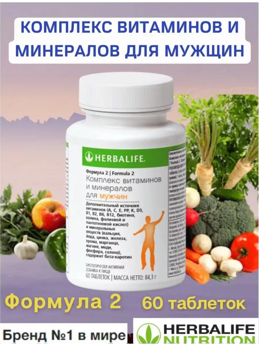 Витамины для мужчин созданы с учетом уникальных потребностей организма мужчин, парней. Всесторонняя поддержка рациона при помощи 24 витаминов и минералов в том числе тех, которые организм не способен выработать самостоятельно или в достаточном количестве. Витамины А и С помогают поддержать защитные силы организма. Магний способствует нормальному функционированию мышц. Рибофлавин поддерживает метаболизм. Витамин B5 способствует поддержке умственной деятельности. Для мужчин витамины улучшают самочувствие, восполняют запас витаминов и минералов. При занятиях спорта поддерживают организм и восстанавливают силы. Отмечается после приема комплекса витаминов прилив сил, бодрость, улучшение самочувствия. Мужские витамины Гербалайф Дополнительный источник витаминов (A, C, E, PP, K, D3, B1, B2, B6, B12, биотина, холина, фолиевой и пантотеновой кислот). Минеральные вещества (кальций, йод, цинк, железо, хром, марганец, магний, медь, фосфор, селен) Бета-каротин. Принимайте 1 таблетке 2 раза в день вместе с едой, и этого хватит, чтобы восполнить организм нужными витаминами. Не является лекарственным средством. Специальный комплекс, созданный с целью обеспечить организм мужчин и женщин оптимальным количеством витаминов и минералов ; Продукт, разработанный экспертами по сбалансированному питанию с использованием самых современных достижений науки. Новая Формула 2 прекрасно сочетается с протеиновым коктейлем Формула 1 для достижения оптимального количества микронутриентов и для похудения. Комплекс из более чем 20 важнейших витаминов и минералов, включая витамины. Отличный подарок мужчине, парню, мужу, папе, брату, дяде.