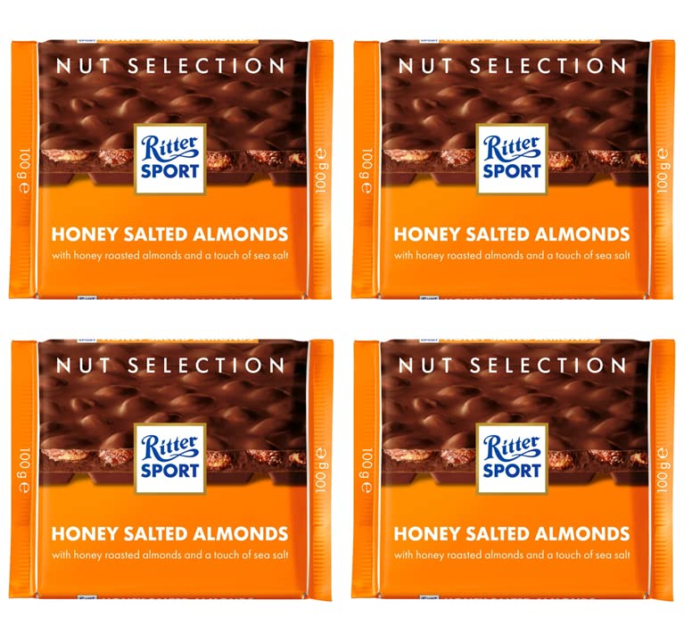 Typical values per 100g: Energy 2346 kJ (563 kcal) Fat 35g - Saturates 15g Carbohydrate 50g - Sugars 48g Protein 9.0g Salt 0.26g Ingredients: sugar, salted almonds with honey coating [almonds (200 ), sugar, vegetable oil (rapeseed, safflower, sunflower), honey (1 ), sea salt (0.2 ), maltodextrin], cocoa butter 1, cocoa mass 1, whole milk powder, lactose, skimmed milk, butter, emulsifier (soy lecithins), milk chocolate: cocoa solids 30 minimum, milk oil 1.8 minimum. Rainforest Alliance Certified allergen information: Contains almonds, may contain celery, may contain cereals containing gluten, may contain eggs, contains milk, may contain mustard, may contain tree nuts, may contain peanuts, contains traces of soy. May contain traces of peanuts, other tree nuts, cereals containing gluten, celery, mustard, and egg.Ritter Sport Lot de 4 barres de chocolat au lait et au sel marin 100 gDESCRIPTION DU PRODUIT Valeurs typiques pour 100 g : Energy2346 kJ (563 kcal) Graisses 35 g - Graisses saturées 15 g de glucides 50 g - Sucres 48 g de protéines 9,0 g de sel 0,26 g d'ingrédients sucre, amandes salées avec revêtement miel [amandes (200 ), sucre Huile végétale (colza, carthame, tournesol), miel (1 ), sel de mer (0,2 ), maltodextrine], beurre de cacao 1, masse de cacao 1, poudre de lait entier, lactose, lait écrémé, beurre, émulsifiant (lécithines de soja), chocolat au lait : solides de cacao 30 minimum, huile de lait 1. 8 minimum. Les informations relatives aux allergènes certifiés Rainforest Alliance contiennent des amandes, peuvent contenir du céleri, peuvent contenir des céréales contenant du gluten, peuvent contenir des œufs, contient du lait, peut contenir de la moutarde, peut contenir des noix, peut contenir des arachides, contient des traces d'allergies au soja. Peut contenir des traces d'arachides, d'autres noix, céréales contenant du gluten, du céleri, de la moutarde la moutarde l'œuf.