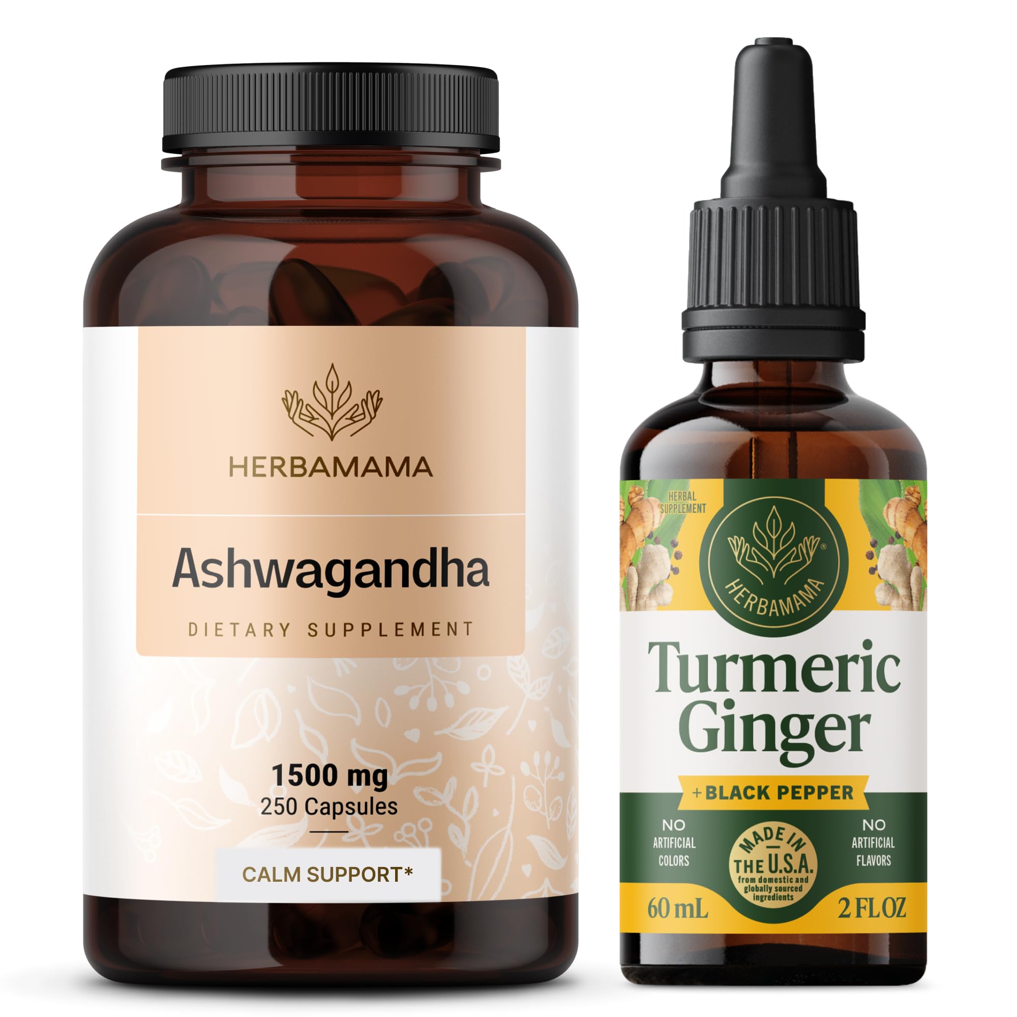HERBAMAMA Ashwagandha and Turmeric Ginger Kit - Bundle of 1500 mg Ashwagandha Root Capsules & Turmeric Ginger Tincture 2 fl oz - Vegan Non-GMO Sugar & Alcohol-Free - 2 Pack