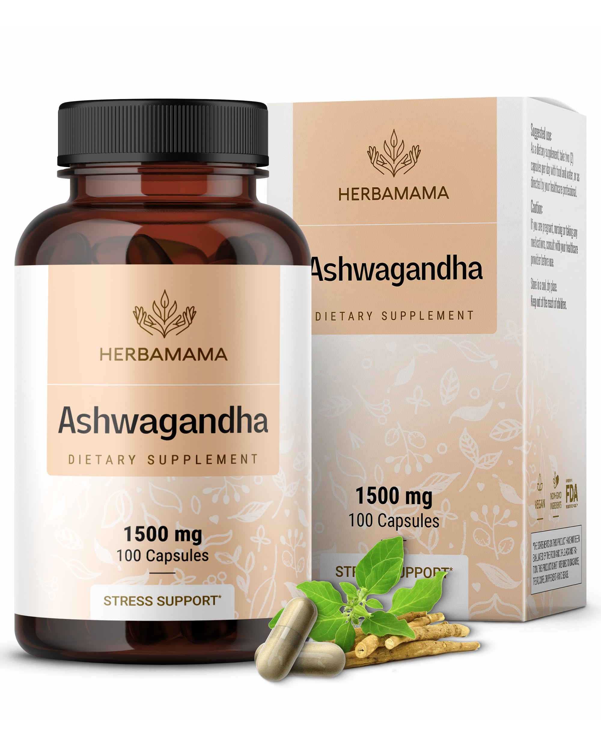 HERBAMAMA Ashwagandha Capsules - 1500mg Pure Ashwagandha Root Focus Supplement - Vegan Non-GMO Mood & Calm Support Supplement for Adults 100 Caps 100 Count (Pack of 1)