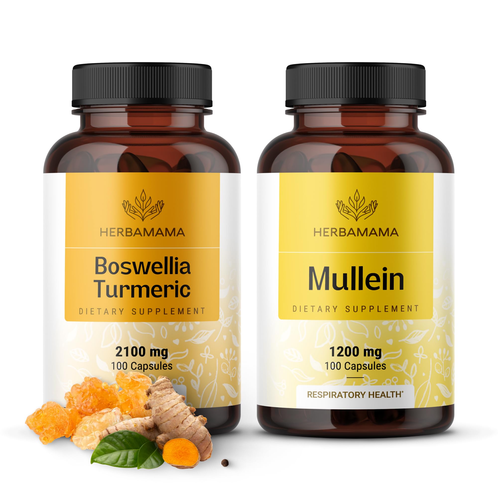HERBAMAMA Boswellia Turmeric and Mullein Leaf Capsules Kit - Bundle of 2100 mg Boswellia Turmeric & 1200 mg Mullein Leaf Capsules - Vegan Non GMO Gelatin-Free - 2 Pack