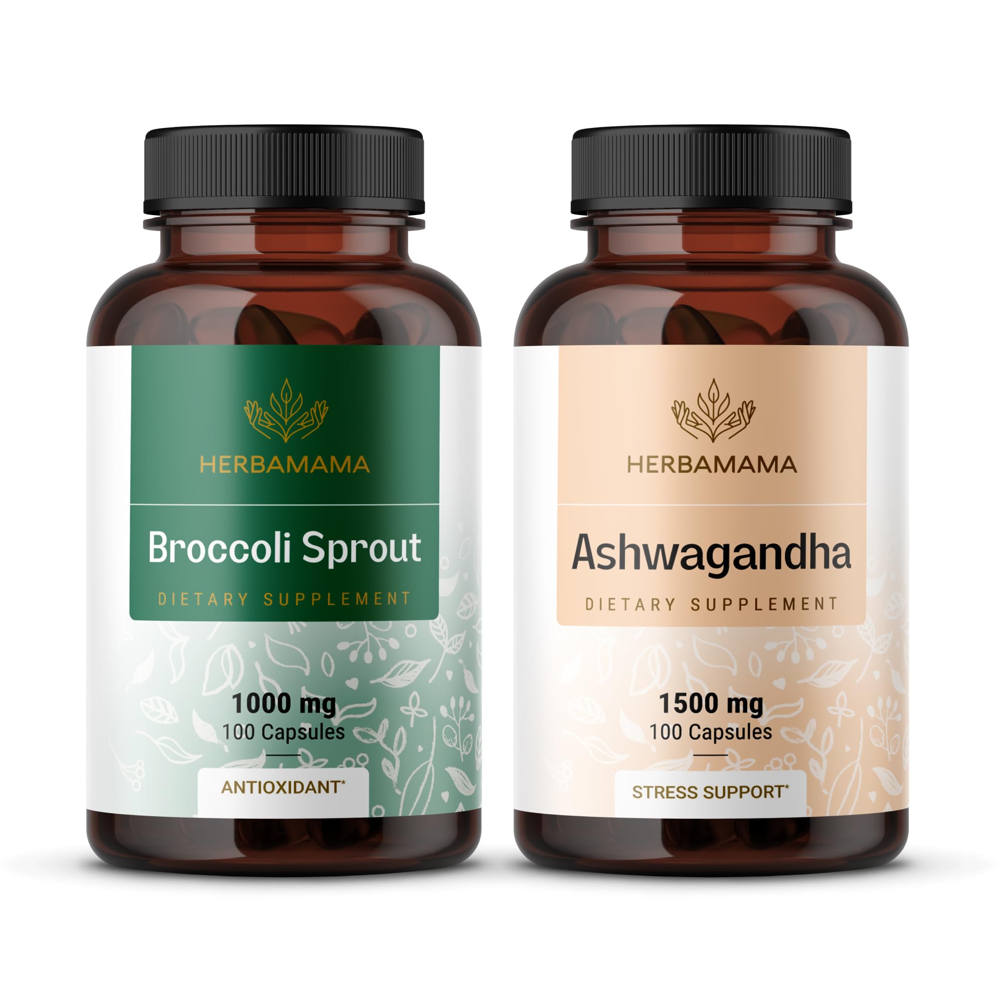 HERBAMAMA Broccoli Sprout and Ashwagandha Root Kit - Bundle of 1000 mg Broccoli Sprout & 1500 mg Ashwagandha Root Capsules - Vegan Non-GMO Sugar & Gelatin-Free - 2 Pack