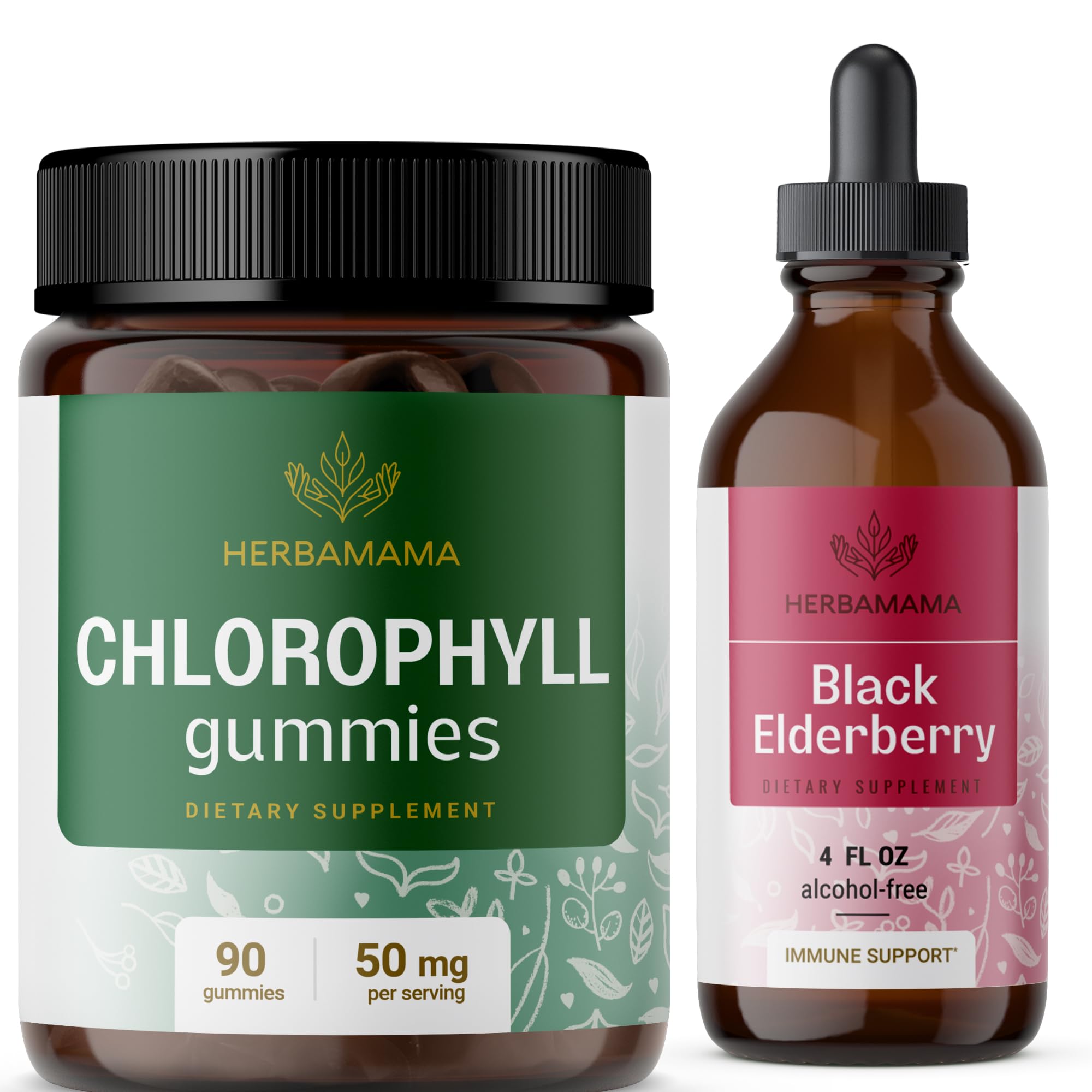HERBAMAMA Chlorophyll and Black Elderberry Kit - Bundle of 50mg Chlorophyll Gummies & Black Elderberry Extract Tincture 4 fl oz - Vegan Non-GMO Sugar & Alcohol-Free - 2 Pack