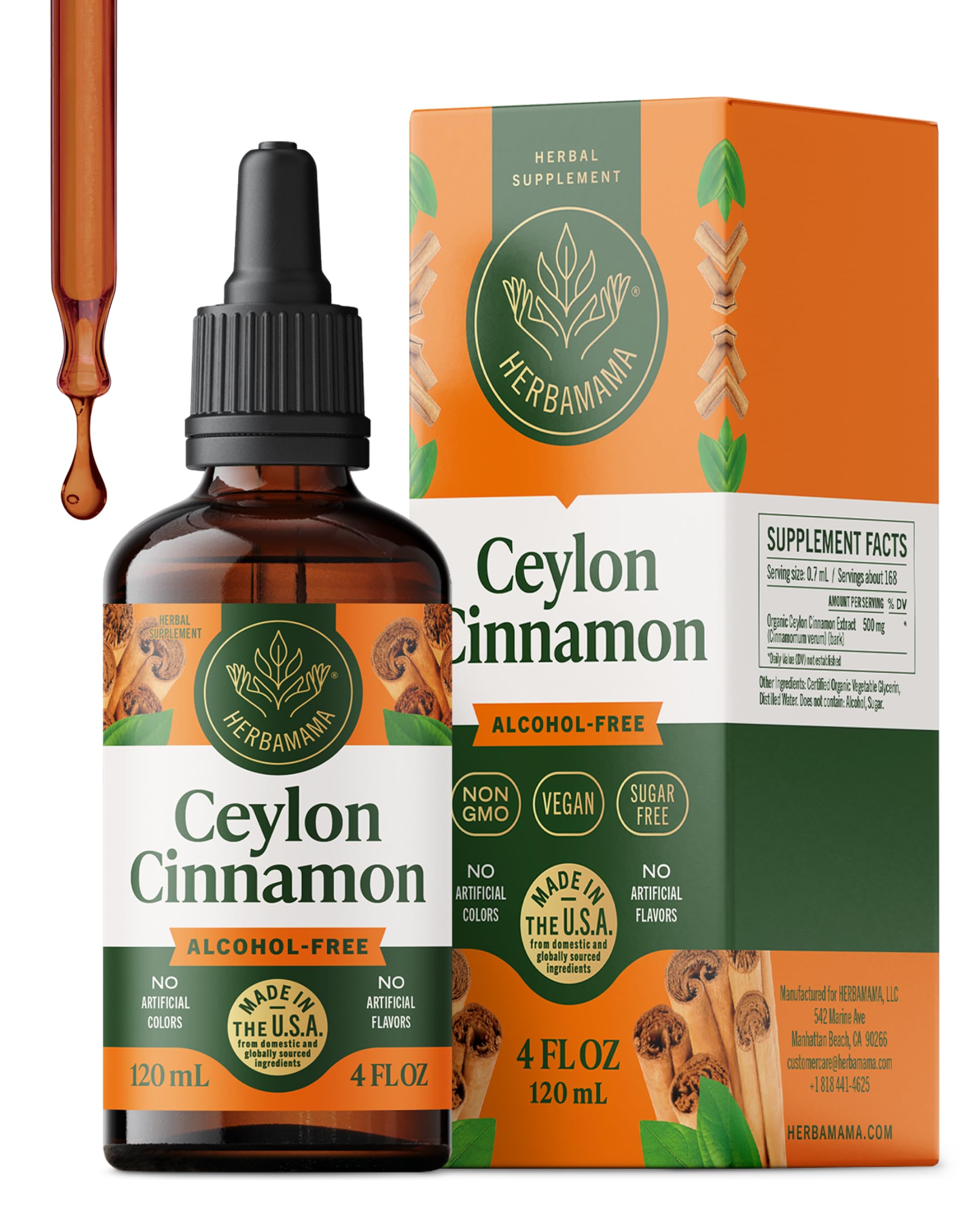 HERBAMAMA Cinnamon Drops - Vegan Antioxidant & Overall Support with Ceylon Cinnamon Extract Liquid Tincture - Non-GMO Alcohol & Sugar-Free Supplement 84-Day Supply 4 Fl Oz (Pack of 1)