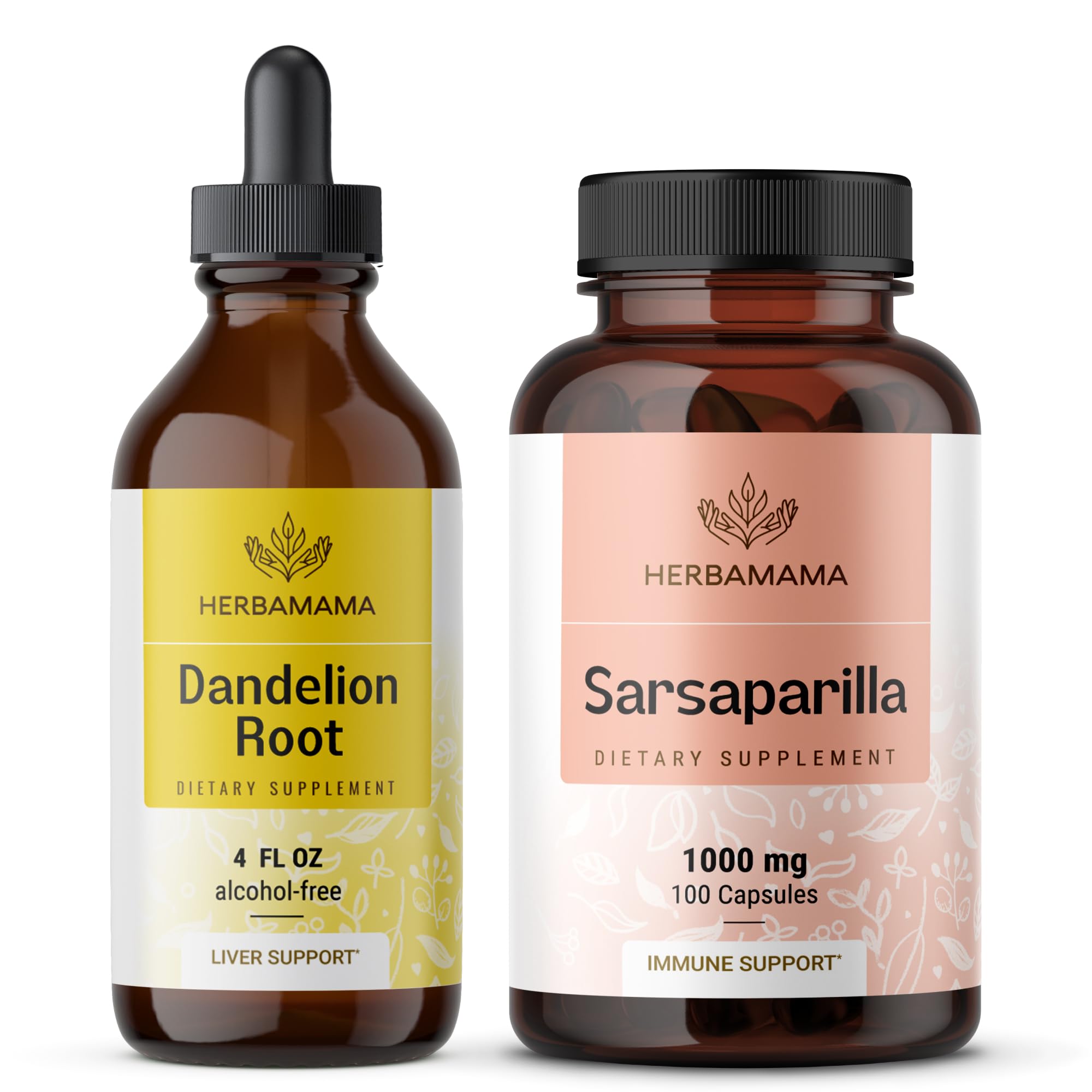 HERBAMAMA Dandelion and Sarsaparilla Roots Kit - Bundle of Dandelion Root Extract 4 Fl Oz & Sarsaparilla Root Capsules - Vegan Non GMO Sugar & Gelatin-Free - 2 Pack