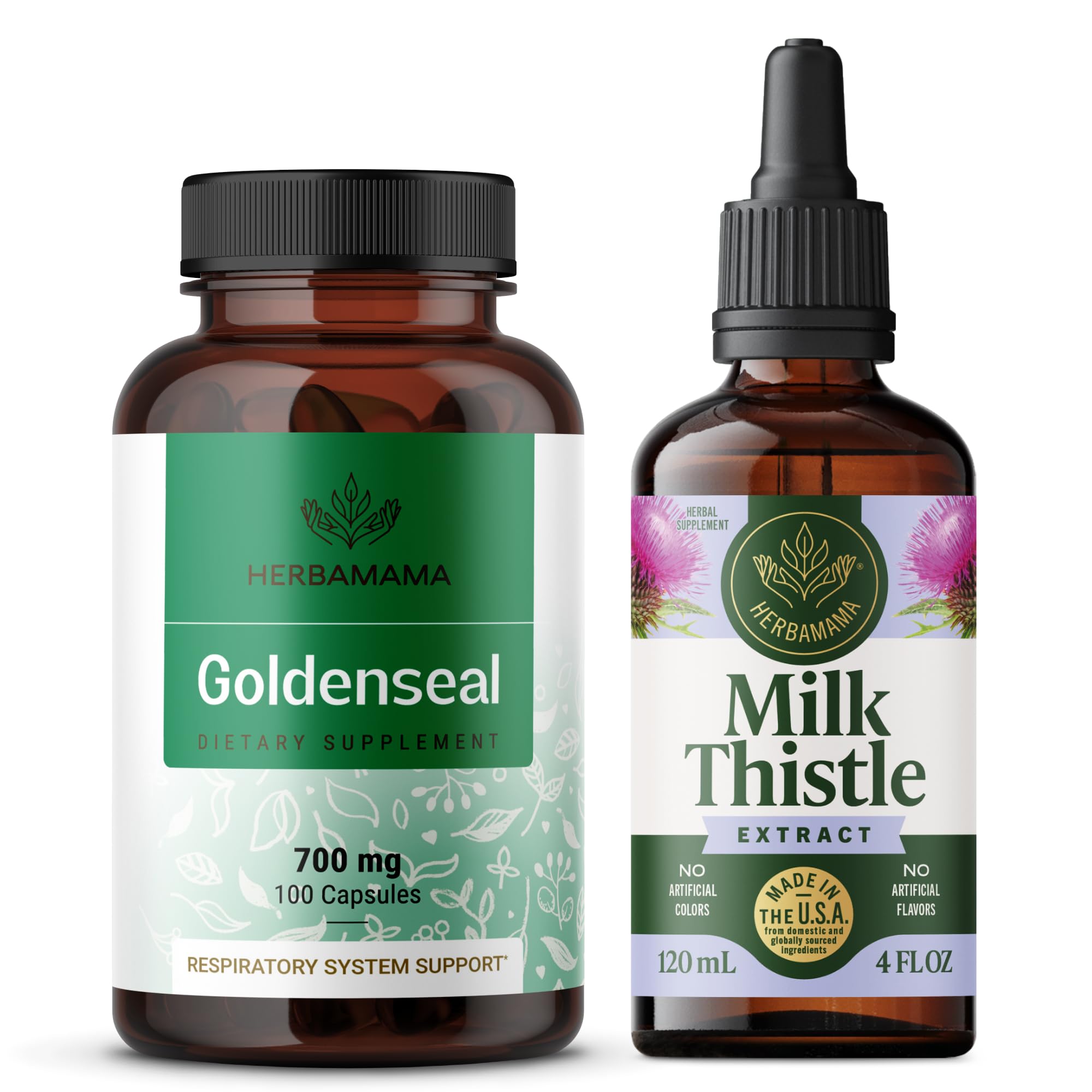 Support your immune and liver health with Herbamama Goldenseal Root capsules and Milk Thistle liquid drops, two powerful supplements crafted for daily wellness. The Goldenseal Root capsules, made from the roots of Hydrastis canadensis L., support gut and immune health, making them a valuable part of your immunity support routine. Vegan-friendly and made with vegetable cellulose, these GMO-free capsules are designed for a variety of lifestyles. With a 100-day supply and an easy-to-swallow format, they are convenient for consistent use at home or on the go. Complementing this, the Milk Thistle liquid drops, made from Silybum marianum, promote liver cleanse and detox. This alcohol-free, vegan, and non-GMO tincture uses glycerin to naturally eliminate bitterness, providing a smooth taste without added sugars. With up to 98 absorption, this simple yet powerful formula contains only three ingredients—water, glycerin, and milk thistle seeds. Each bottle offers a 28-day supply, making it a convenient addition to your liver support routine. Together, these supplements provide comprehensive immune and liver health support, making them suitable for a variety of lifestyles.For a Variety of Lifestyles: Herbamama's Goldenseal root immunity support capsules and Milk Thistle liver cleanse drops are gluten-free, non-GMO, and free from artificial colors or fillers. Crafted with a vegan formula based on vegetable glycerin, without alcohol or sugar, these supplements are designed to complement any lifestyle. Only Three Ingredients: Herbamama's Milk thistle liver supplement features a simple formula with just three ingredients - Silybum marianum, vegetable glycerin, and distilled water. Made vegetarian, with an easy-to-digest formula and no artificial additives. Only Two Ingredients: Our digestive support capsules feature a simple, plant-based formula with just two ingredients - Goldenseal root powder and a vegetable cellulose capsule. Made vegetarian, with an easy-to-digest formula with no artificial additives. Liver Detox: Each drop of Herbamama's Milk thistle liver detox drops is crafted to support liver wellness. Our pure Milk thistle extract liver health formula provides liver cleanse, ensuring overall liver health. Immune Health Support: Herbamama's Goldenseal powder capsules are crafted to support your immune and respiratory health.