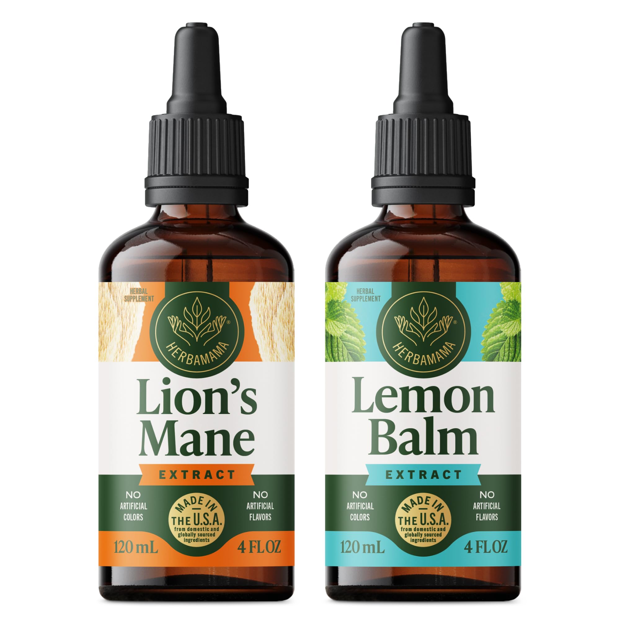 Experience the complementary benefits of Herbamama Lion's Mane Tincture and Lemon Balm Leaf Tincture—two natural supplements designed to support your focus and calmness. Herbamama Lion's Mane Tincture, made from the Hericium erinaceus mushroom, promotes clarity, focus, and alertness. These carefully crafted mushroom drops use glycerin to eliminate bitterness, delivering a smooth, pleasant taste without added sugars. Free from alcohol, artificial colors, and flavors, this vegan and non-GMO liquid supplement integrates seamlessly into various lifestyles. With only three pure ingredients—water, glycerin, and lion's mane mycelium—our tincture offers up to 98 absorption. Shake well before adding one dropperful to your drink or placing it directly under your tongue twice a day. With an 84-day supply, it's an easy way to support your brain health daily. For moments of calm, Herbamama Lemon Balm Leaf Tincture, crafted from Melissa officinalis, helps promote relaxation. This tincture uses glycerin to naturally eliminate bitterness, providing a smooth, sweet taste without added sugars. Alcohol-free, vegan, and non-GMO, it suits a variety of lifestyles. With only three simple ingredients—water, glycerin, and lemon balm leaves—it offers purity with up to 98 absorption. Shake well before adding one squeeze of the dropper to your favorite drink or placing it under your tongue three times daily. Each bottle provides a 56-day supply, supporting your relaxation routine effortlessly. Together, these tinctures create the natural blend of productivity and peace—start your day with Lion's Mane to stay alert and calm with Lemon Balm. With Herbamama's natural, vegan tinctures, you'll feel supported from morning to night, supporting focus and calmness throughout your day.Shake Well Before Use: Add one squeeze of the dropper bulb to a glass of water, tea or your favorite juice. You can drop Herbamama liquid supplement directly onto your tongue, but avoid contact between the dropper and your mouth. Fast Absorption: Our liquid herbal supplement formula provides up to a 98 absorption in just two-five minutes. These quickly absorbed drops deliver all the benefits of powerful herbs. Simple, Pure Ingredients: Herbamama liquid supplements feature a simple formula with just plant-based ingredients - herbal extract, vegetable glycerin, and distilled water. Made vegetarian, with an easy-to-digest formula and no artificial additives. Calming Support: Each drop of Herbamama's Lemon balm tincture is crafted to support your calmness. Our pure Lemon balm drops provide calm support, ensuring overall relaxation. Brain Focus Support: Each drop of Herbamama's Lion's mane mushroom drops is crafted to support your brain health. Our Lion's mane extract liquid drops may help maintain a keen mind, ensuring focus, alertness, and brain clarity.
