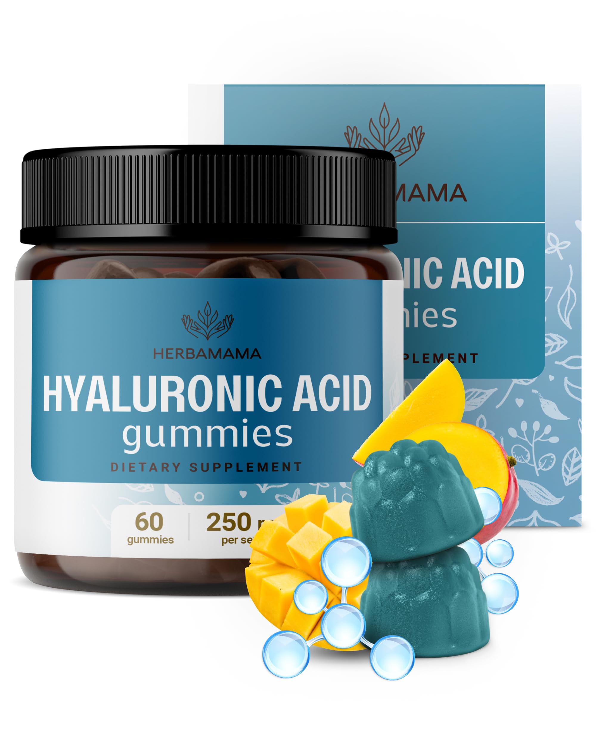 How to Use: Incorporating Herbamama's gummies into your routine is easy, and you'll enjoy their juicy taste. Simply chew two Hyaluronic acid with Vitamin C gummies once daily, preferably with meals. Convenient On-the-Go: Enjoy the ease of bite-sized Hyaluronic acid for hair, nails, and skin. Herbamama pectin-based gummies are coated with tapioca to prevent sticking and are designed to resist melting, even in hot weather or when held in your hands. Soft and Fruity: Experience the softness of our Hyaluronic acid supplement. Herbamama's Hyaluronic acid powder gummies are pectin-based for a smooth easy-to-chew texture. The fruity mango flavor makes your routine even more enjoyable. Vegan and Non-GMO: Our Hyaluronic acid supplements are gelatin-free, vegan, gluten-free, and non-GMO. These hair skin and nails gummies are made from pure ingredients. They are free from artificial colors or any additives and are gentle on your digestion. Skin Hydration Support: Herbamama's Hyaluronic Acid gummies provide natural nourishment and hydration for hair, skin, and nails. Support your overall hydration and elasticity with our fast-absorbing Hyaluronic acid chewables.