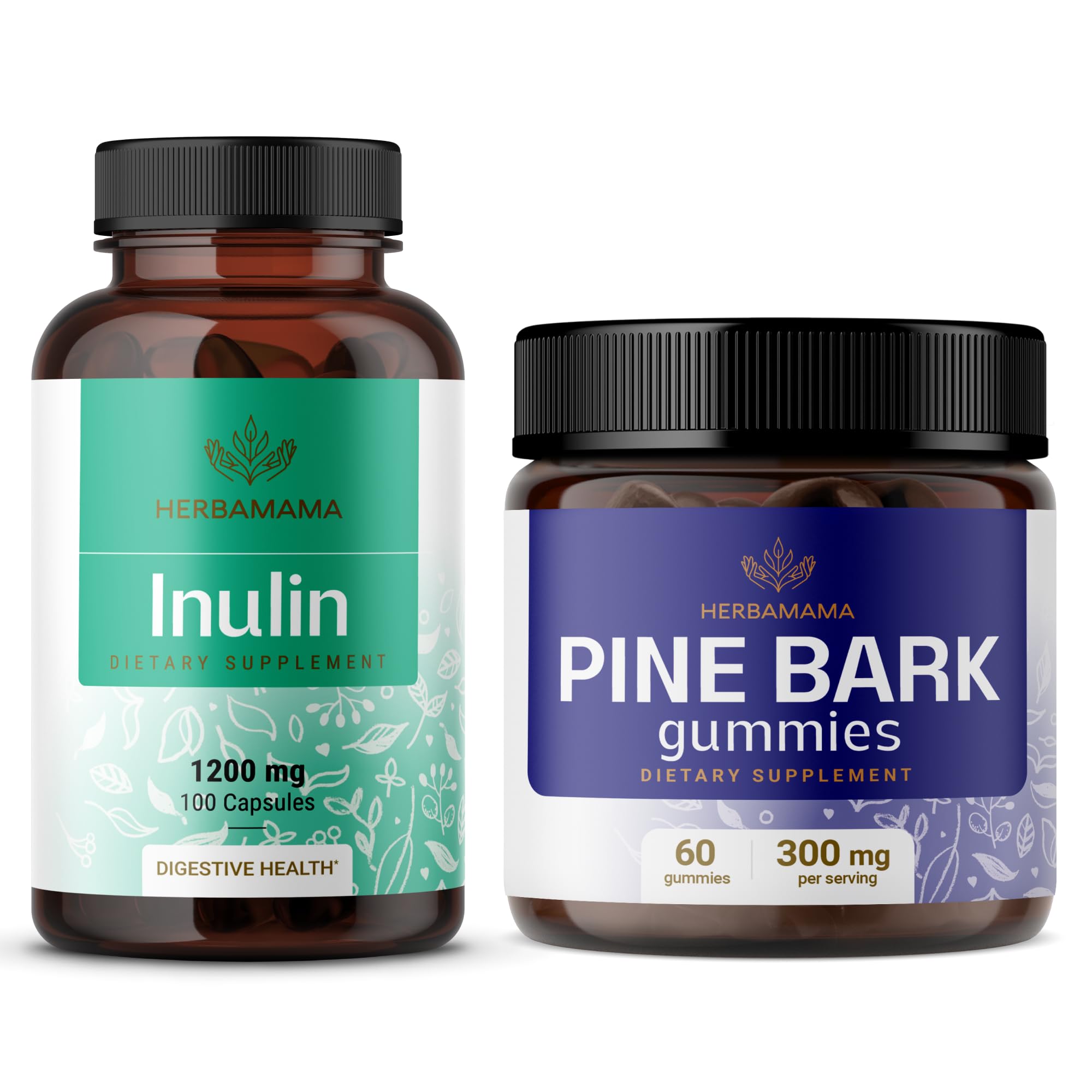 HERBAMAMA Inulin and Pine Bark Kit - Bundle of Inulin Fiber Capsules & Pine Bark Blueberry-Flavored Gummies - Vegan Non-GMO Gelatinl-Free - 2 Pack
