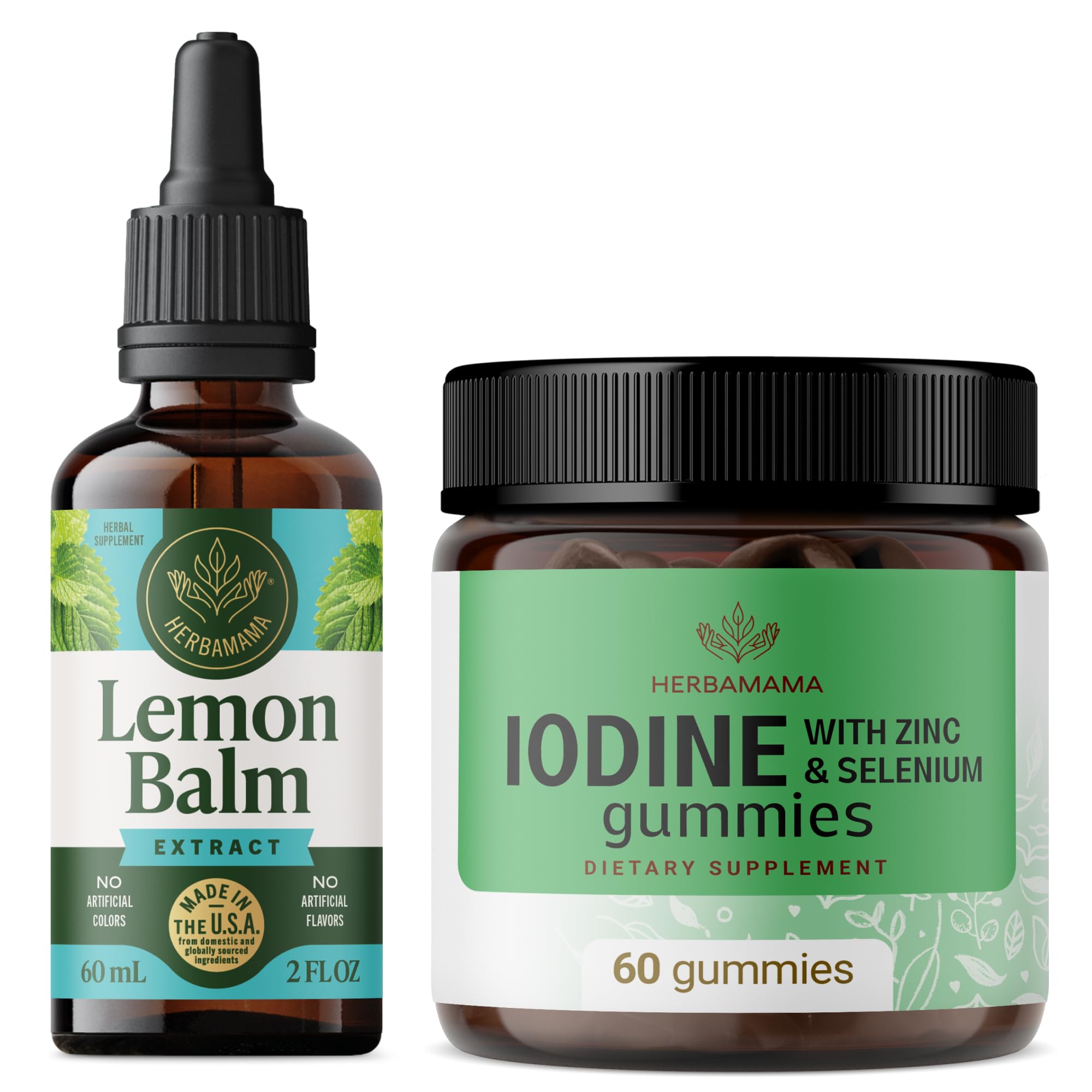 HERBAMAMA Lemon Balm and Iodine Kit - Bundle of Lemon Balm Tincture 2 Fl Oz & Potassium Iodine Gummies 60 - Vegan Non-GMO Alcohol & Gelatin-Free - 2 Pack
