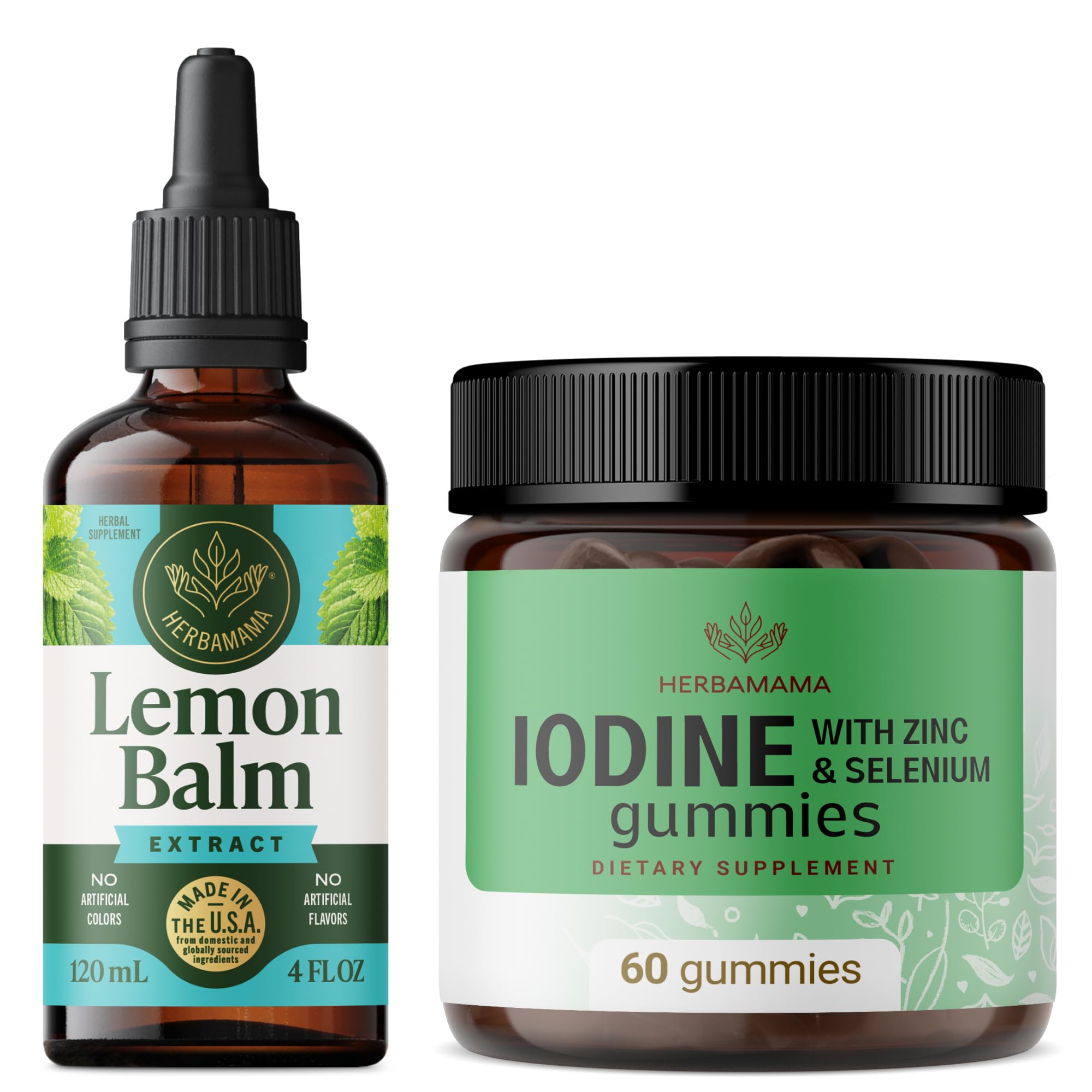 HERBAMAMA Lemon Balm and Iodine Kit - Bundle of Lemon Balm Tincture 4 fl oz & Potassium Iodine Gummies - Vegan Non-GMO Alcohol & Gelatin-Free - 2 Pack