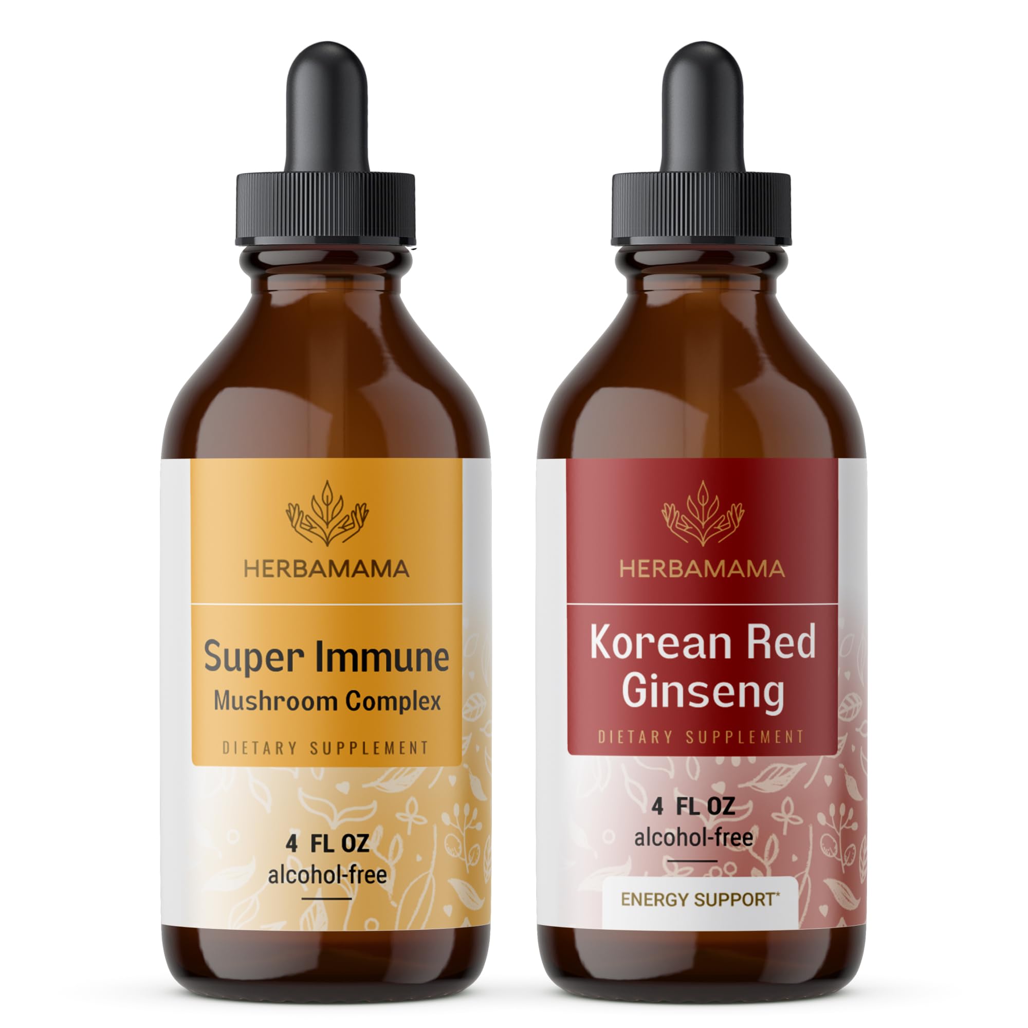 Experience the dual benefits of Herbamama Multi-Mushroom Immune Support Tincture and Korean Red Ginseng Extract Liquid Drops, two powerful supplements crafted to support both immune function and energy. The Multi-Mushroom Tincture, made from a powerful blend of eight mushrooms—including lion's mane, agaricus, chaga, cordyceps, maitake, reishi, shiitake, and turkey tail—supports immunity by harnessing the natural compounds of these powerful mix. Free from alcohol, artificial colors, and flavors, this vegan, non-GMO tincture uses glycerin to eliminate bitterness and ensure a smooth taste with up to 98 absorption. Each bottle provides a 56-day supply, making it an easy addition to your daily immune support routine. Complementing this, the Korean Red Ginseng Extract, made from Panax ginseng, promotes energy and antioxidant support. This vegan, non-GMO tincture is also crafted with glycerin for a smooth, sugar-free taste and up to 98 absorption. Like the mushroom tincture, it contains only three ingredients—water, glycerin, and red Korean ginseng extract—and provides a 56-day supply, making it a convenient part of your daily energy support regimen. Together, these supplements offer comprehensive immune, brain, and energy support, crafted with natural, vegan ingredients to suit a variety of lifestyles.Shake Well Before Use: Add one squeeze of the dropper bulb to a glass of water, tea or your favorite juice. You can drop Herbamama liquid supplement directly onto your tongue, but avoid contact between the dropper and your mouth. Fast Absorption: Our liquid herbal supplement formula provides up to a 98 absorption in just two-five minutes. These quickly absorbed drops deliver all the benefits of powerful herbs. Simple, Pure Ingredients: Herbamama liquid supplements feature a simple formula with just plant-based ingredients - herbal extract, vegetable glycerin, and distilled water. Made vegetarian, with an easy-to-digest formula and no artificial additives. Ginseng Energy Support: Each drop of Herbamama's Korean Panax Ginseng extract liquid energy supplement is crafted to support your overall welness. Our Panax Ginseng root tincture delivers antioxodant properties for the active lifestyle. Mushroom Immune Support: Each drop of Herbamama's mushroom complex liquid drops is crafted to support immune health. Our vegan eight-mushroom blend supplements provide immune support, ensuring overall wellness.