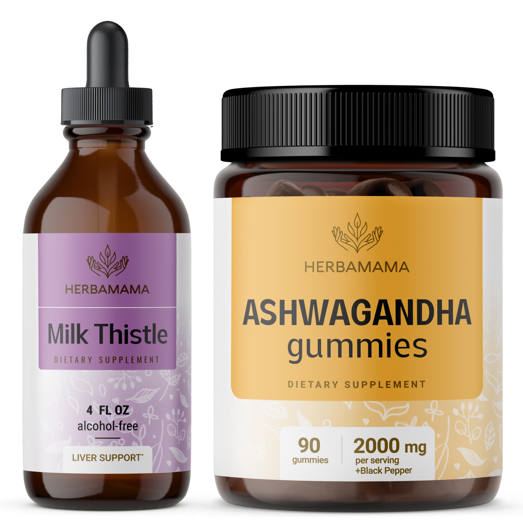 HERBAMAMA Milk Thistle and Ashwagandha Kit - Bundle of Milk Thistle Extract & 2000 mg Ashwagandha Root Gummies - Vegan Non-GMO Alcohol-Free - 2 Pack