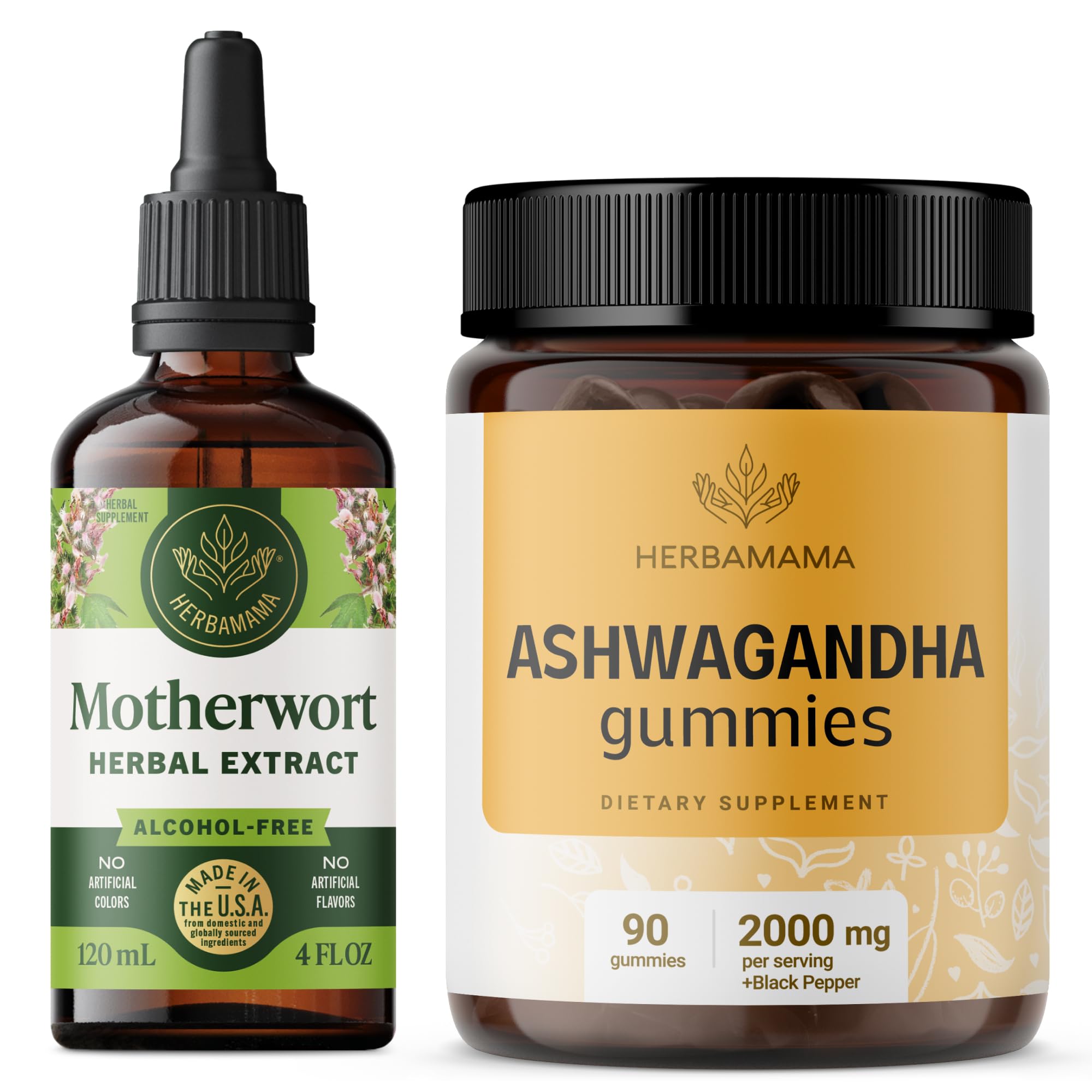 HERBAMAMA Motherwort and Ashwagandha Kit - Bundle of Liquid Motherwort Tincture 4 fl oz & Ashwagandha Gummies - Vegan Non-GMO Gelatin & Alcohol-Free - 2 Pack