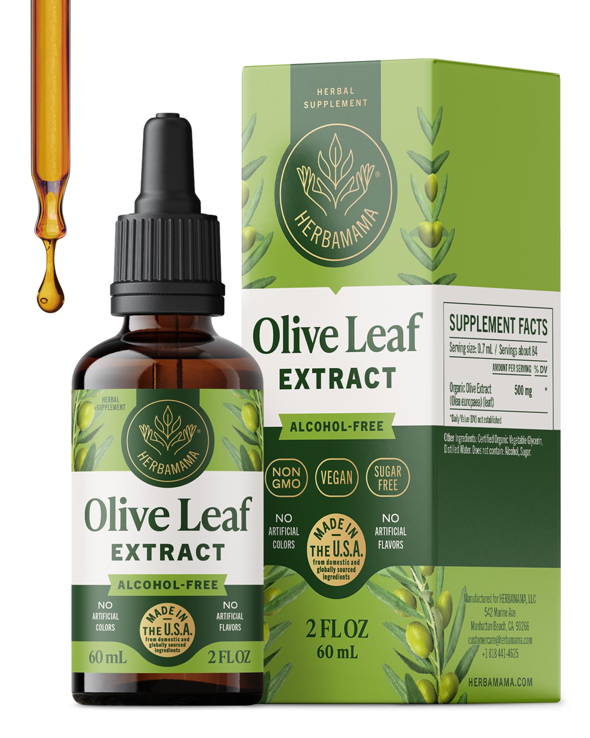HERBAMAMA Olive Leaf Tincture - Vegan Immune Support with Oleuropein Olive Leaf Extract Liquid Drops - Non-GMO, Alcohol & Sugar-Free Oleuropein Supplement, 42-Day Supply 2 Fl Oz (Pack of 1)