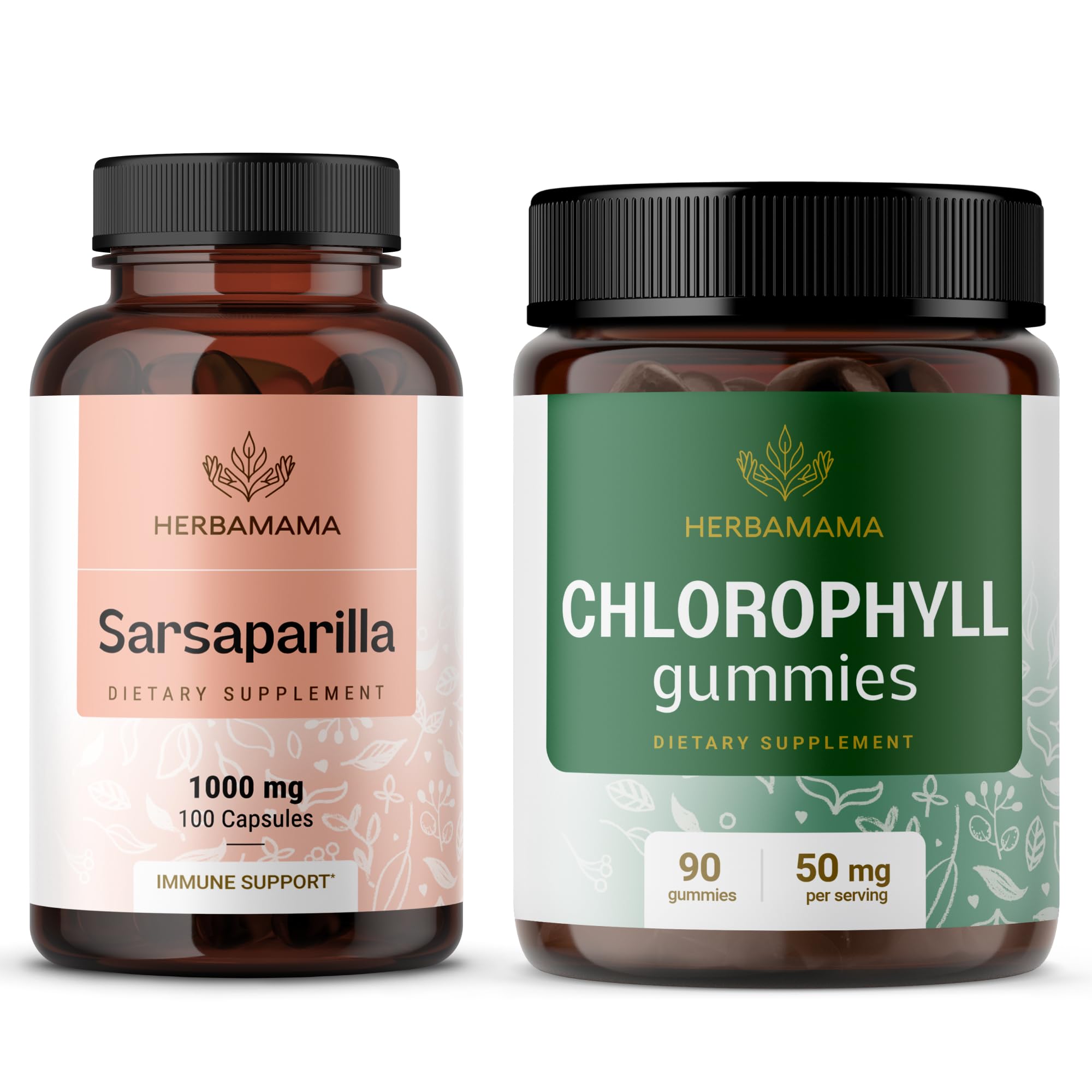 HERBAMAMA Sarsaparilla and Chlorophyll Kit - Bundle of 1000 mg Sarsaparilla Root Capsules & 50 mg Chlorophyll Gummies - Vegan Non-GMO Gelatin-Free - 2 Pack